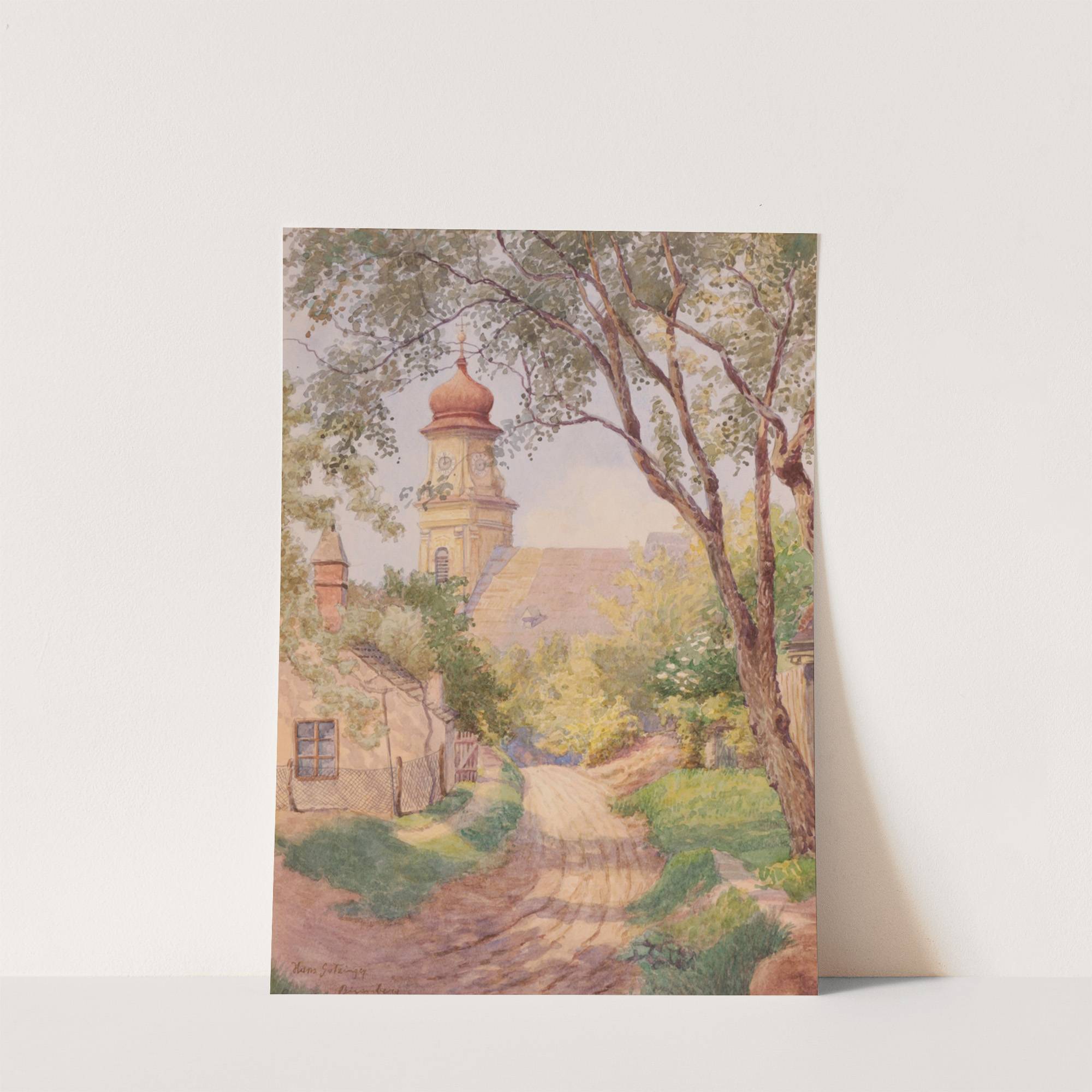 This exquisite watercolor painting titled "Bisamberg" by Hans Götzinger beautifully captures the serene essence of a rural village setting. The scene is dominated by a quaint church with a prominent, warm red onion dome tower rising above the greenery. Sunlight...