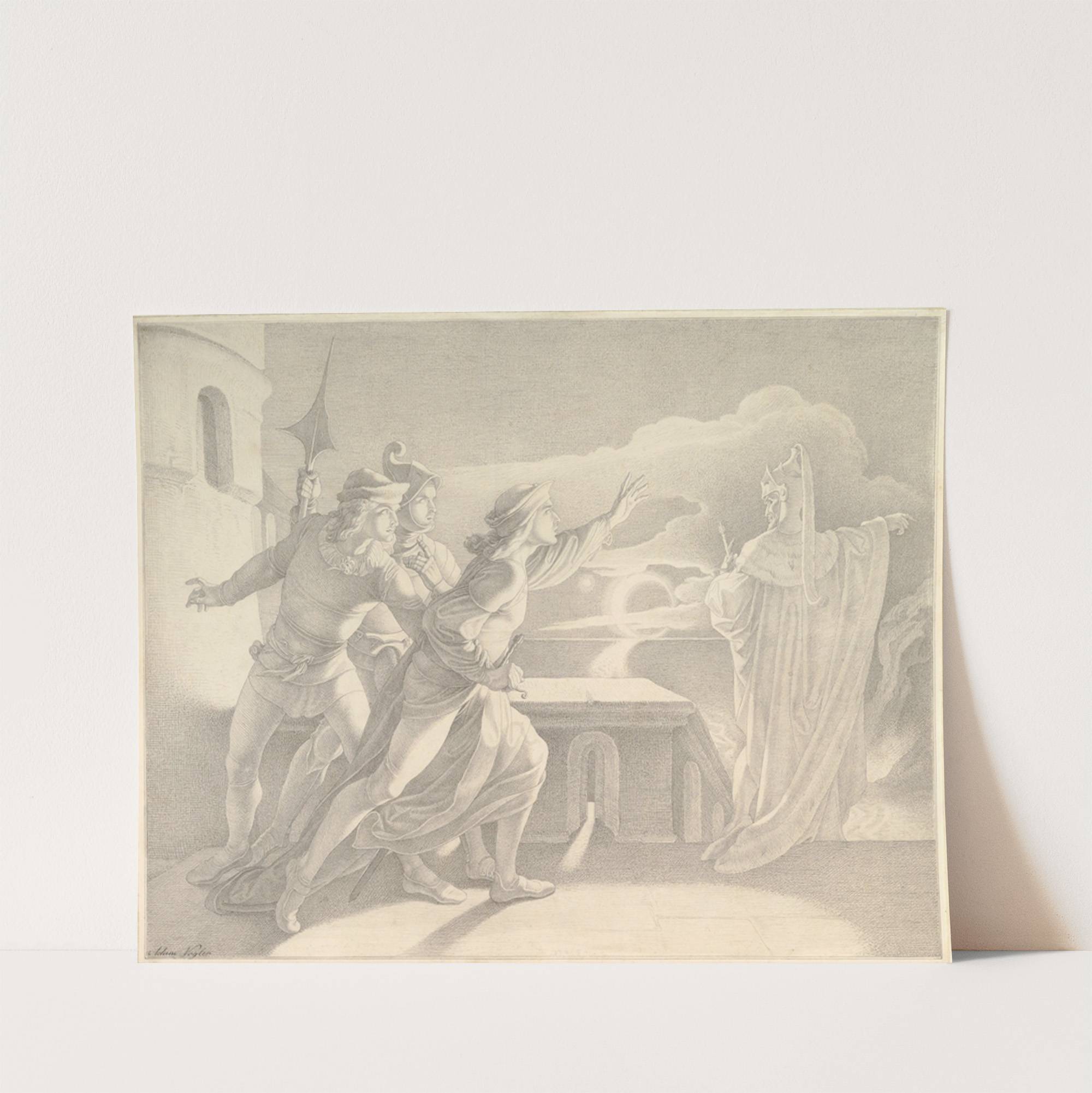 This elegant black-and-white print features "Hamlet and the Ghost of his Father" by artist Adam Vogler. The image is rendered in delicate pencil strokes, showcasing intricate detail and classical style. At its center, a muscular male figure dressed in medieval...