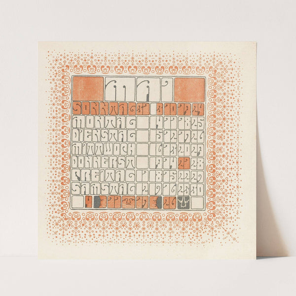 This art print features a visually striking calendar grid designed by Alfred Roller in a unique, abstract style. The calendar consists of a grid with each day's date clearly marked in both white and orange lettering within square cells. The...