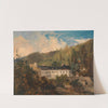 This painting, "Motiv aus Neuwaldegg" by Adalbert Stifter, captures the serene beauty of a rural landscape bathed in the golden hues of early evening light. Dominating the foreground is a white stately building with dark roof tiles, its architecture suggesting...