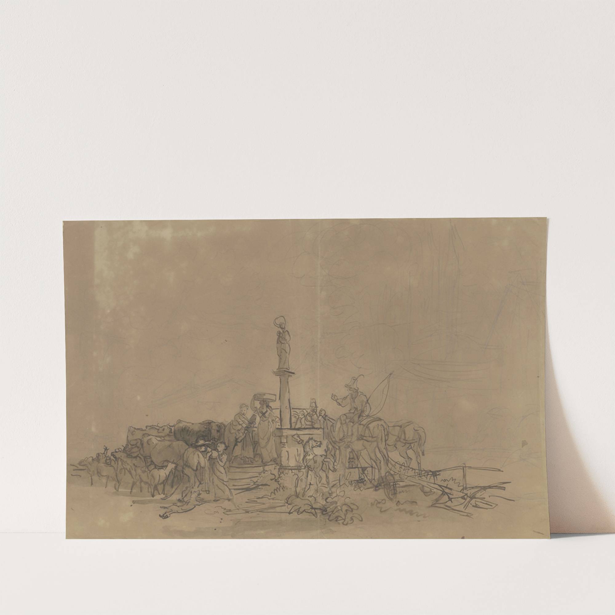Tiroler Dorfbevölkerung und Tiere um einen Brunnen mit dem Standbild der Jungfrau Maria by Friedrich Gauermann - Wall Art Print