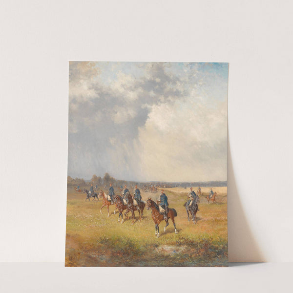 This exquisite oil painting by Alexander Von Bensa titled "Ungarische Husaren" depicts a vibrant scene of Hungarian hussars on horseback in an open field at dawn or dusk. The sky is painted with soft, luminous clouds in hues of blue...