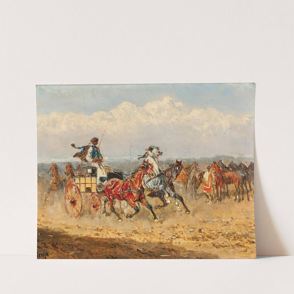 Experience the dynamic energy of rural life in this vibrant oil painting titled "Ungarischer Pferdmarkt" by Alexander Von Bensa. This captivating artwork captures the essence of an early 19th-century horse market scene, where a coachman expertly guides his spirited horses...