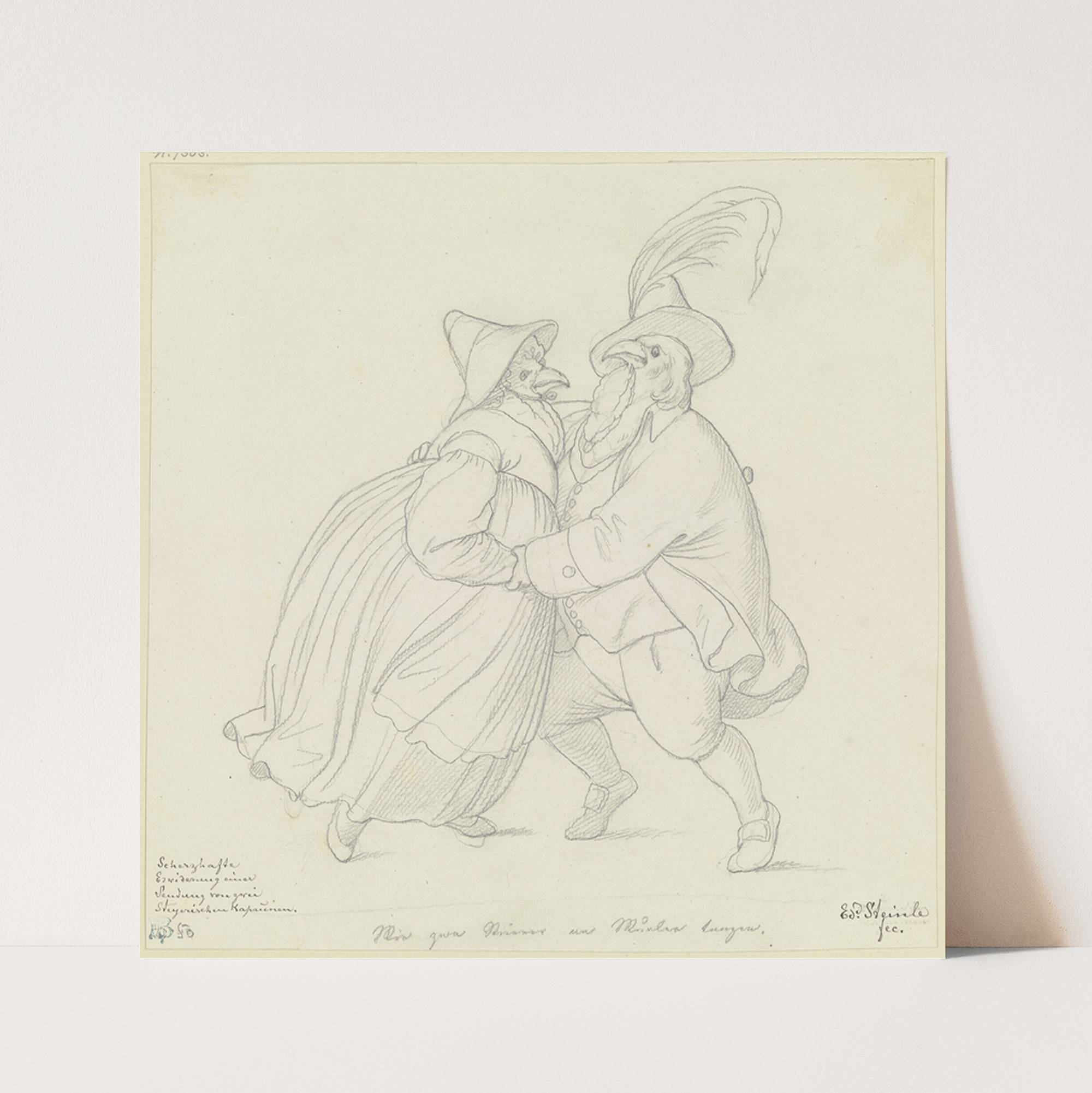 Zwei Kapaune als Steyerisches Bauernpaar tanzend by Eduard von Steinle - Wall Art Print