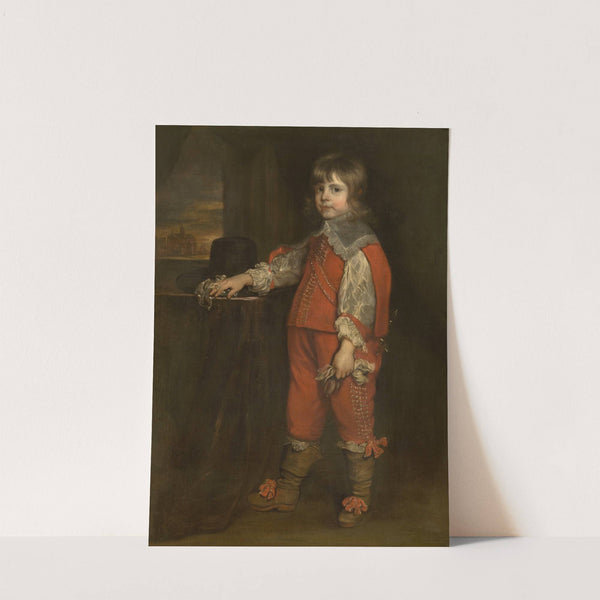 This exquisite portrait captures the youthful elegance of Charles II as Prince of Wales, rendered by the renowned artist Adriaen Hanneman in a classical Baroque style. The child prince stands confidently in richly detailed attire: vibrant red velvet breeches are...