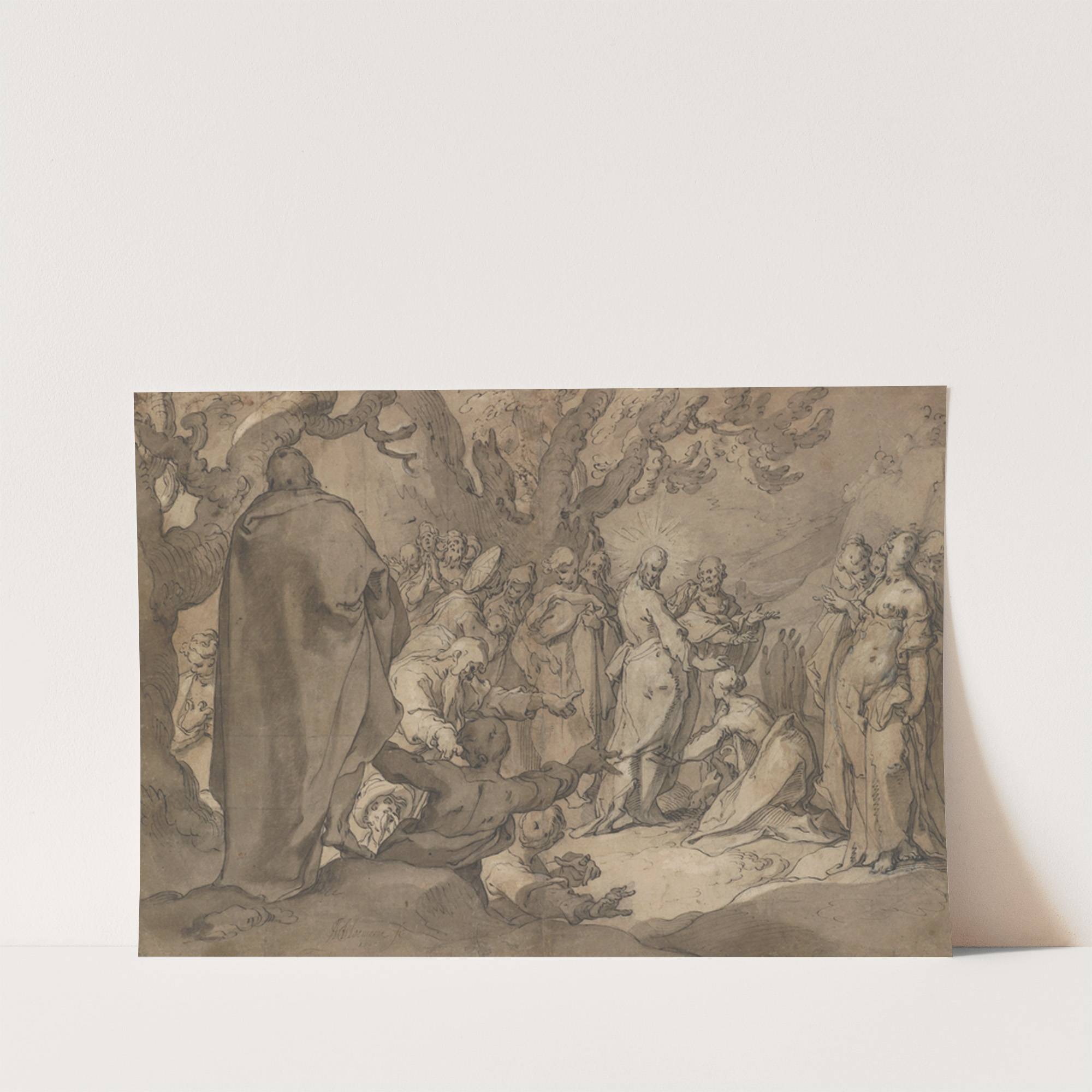This exquisite art print features "Christ and the Canaanite Women" by Abraham Bloemaert, a masterpiece in classical Renaissance style. Rendered in delicate sepia tones with meticulous, expressive line work, this piece captures a powerful biblical scene. At the center, Christ...