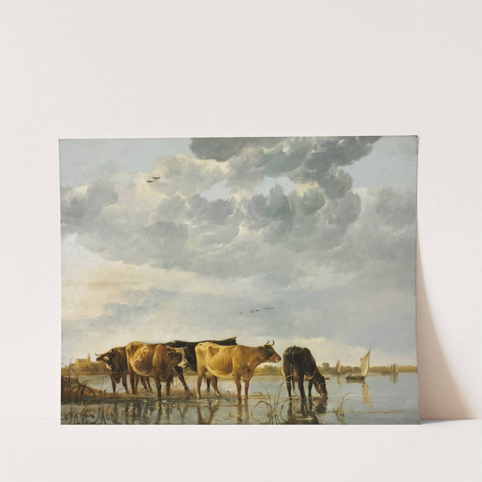 This captivating art print showcases "Cows in a River" by Albert Cuyp, capturing the serene beauty of pastoral life. The painting features five cows standing on the gentle banks of a tranquil river, their reflections shimmering in the water below....