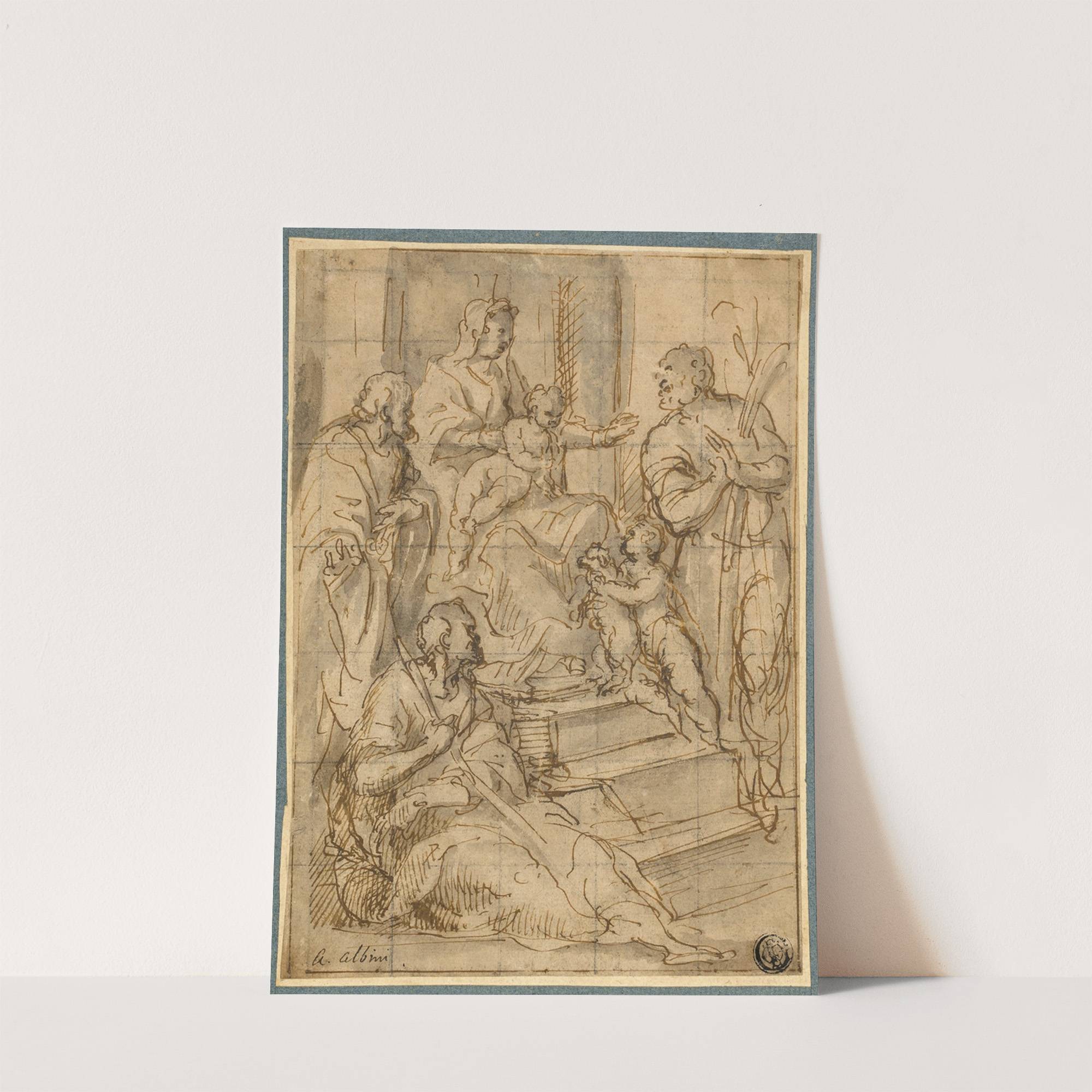 Discover the timeless elegance of "Holy Family with the Infant Saint John the Baptist and Two Male Saints" by Alessandro Albini. This exquisite drawing, rendered in delicate sepia tones, captures a moment of serene divine interaction. Central to the composition...