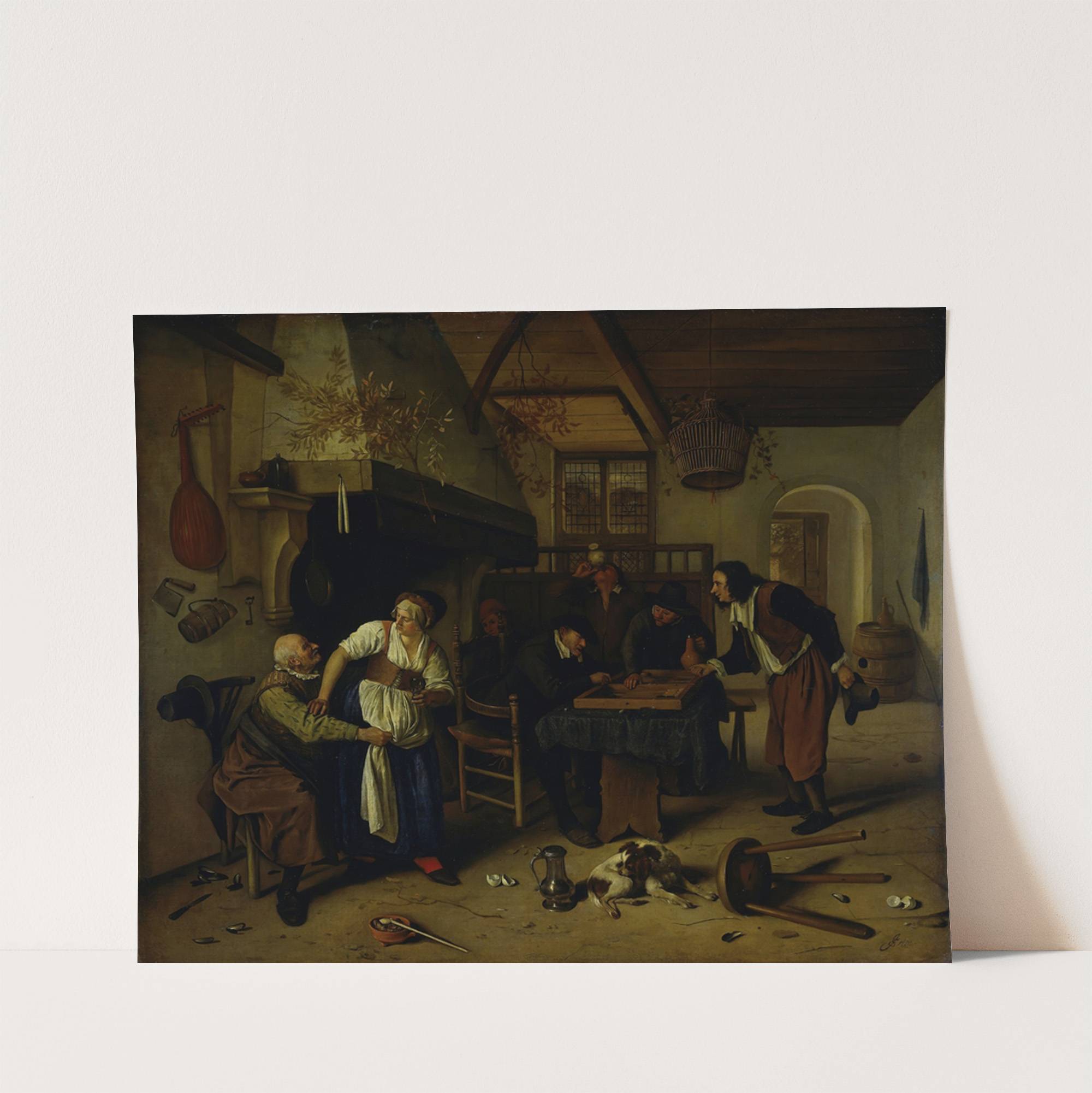 Interior of an inn with an old man amusing himself with the landlady and two men playing backgammon, known as ‘Two kinds of games’ by Jan Steen - Wall Art Print