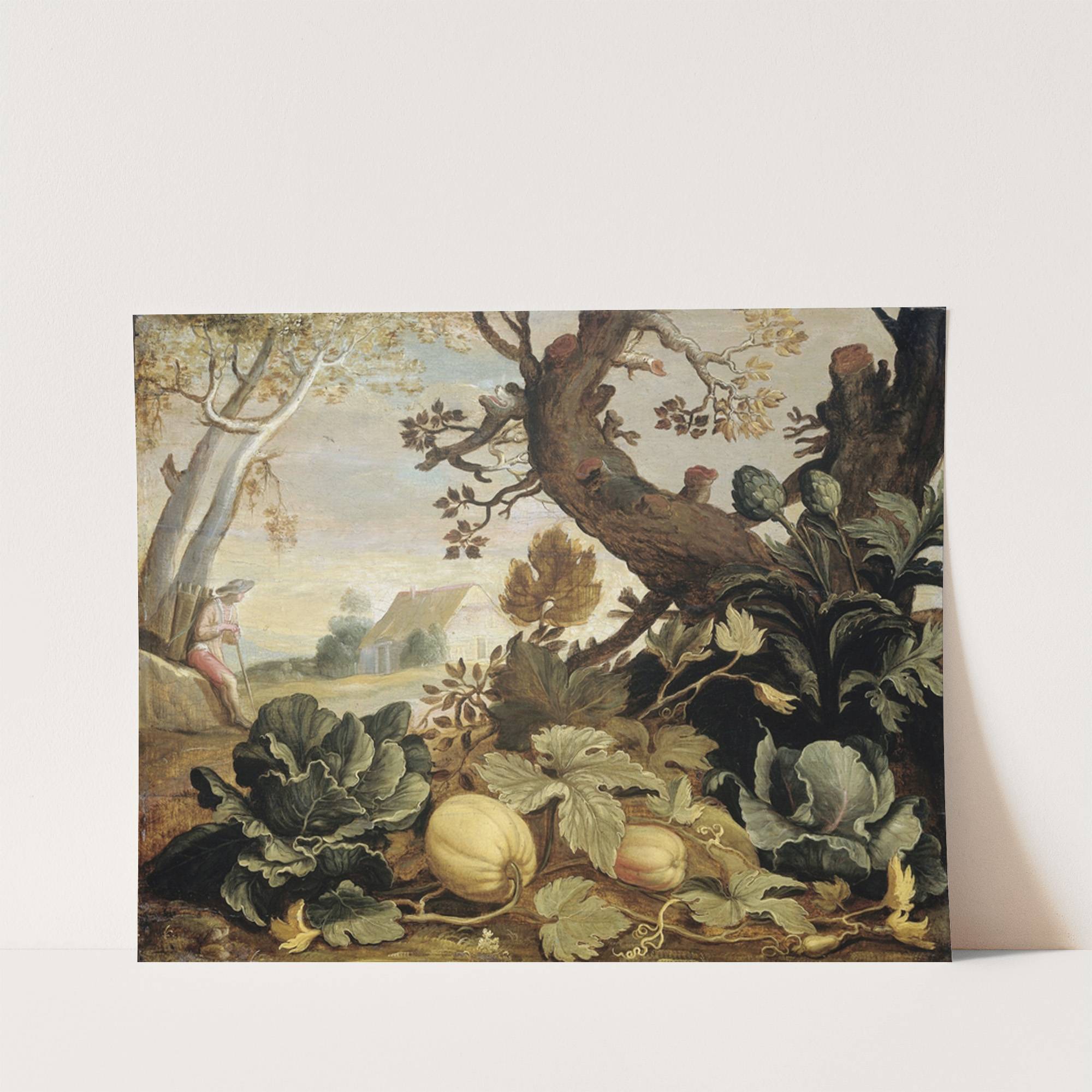 This beautiful art print features "Landscape with Fruits and Vegetables," a masterpiece by Abraham Bloemaert. The scene is richly detailed, showcasing a lush garden setting that exudes natural beauty and tranquility. Dominating the composition are large, dark green cabbage leaves...