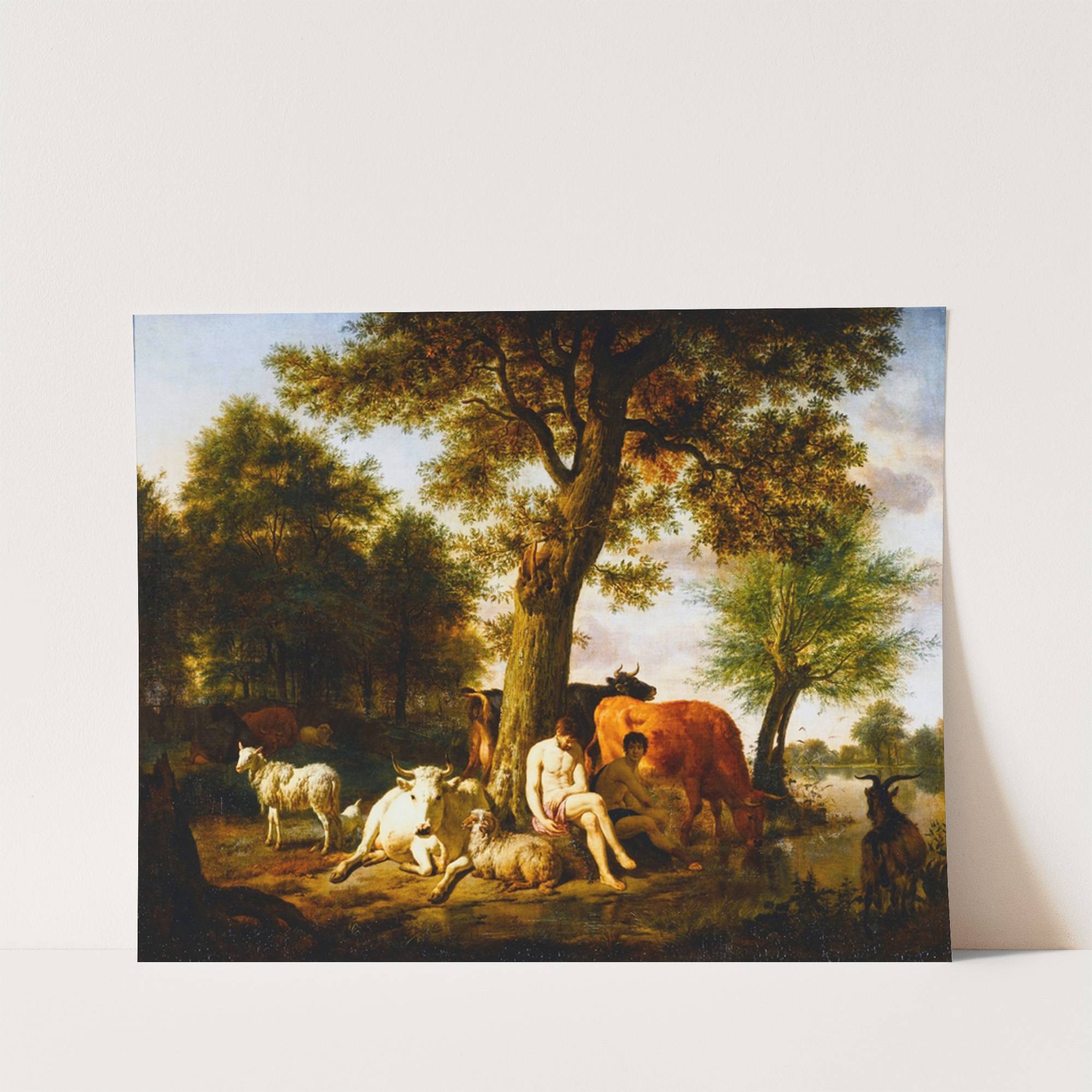 This stunning print features "Mercury, Argus and Io" by Adriaen van de Velde, capturing a serene pastoral scene with remarkable detail and vivid color. The central focus is on a group of cows resting in the shade of tall trees....