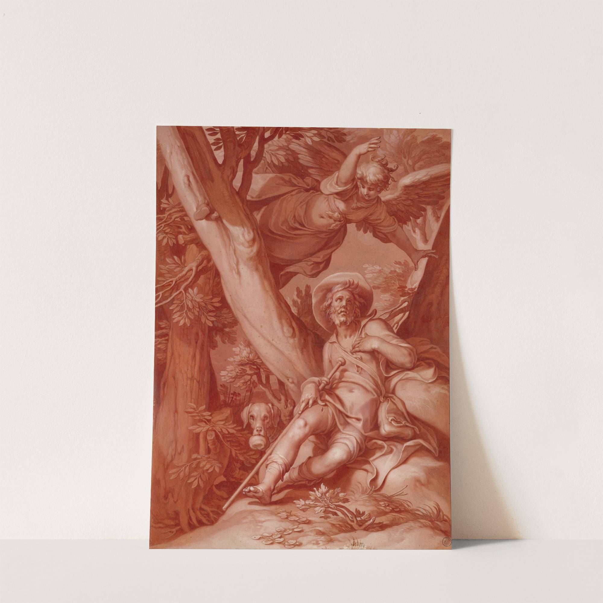 Experience the timeless beauty of classical art with this intricately detailed monochromatic red lithograph titled "St. Roch" by Abraham Bloemaert. This captivating piece features a central figure of Saint Roch, depicted in dynamic motion, reclining on a tree root amidst...