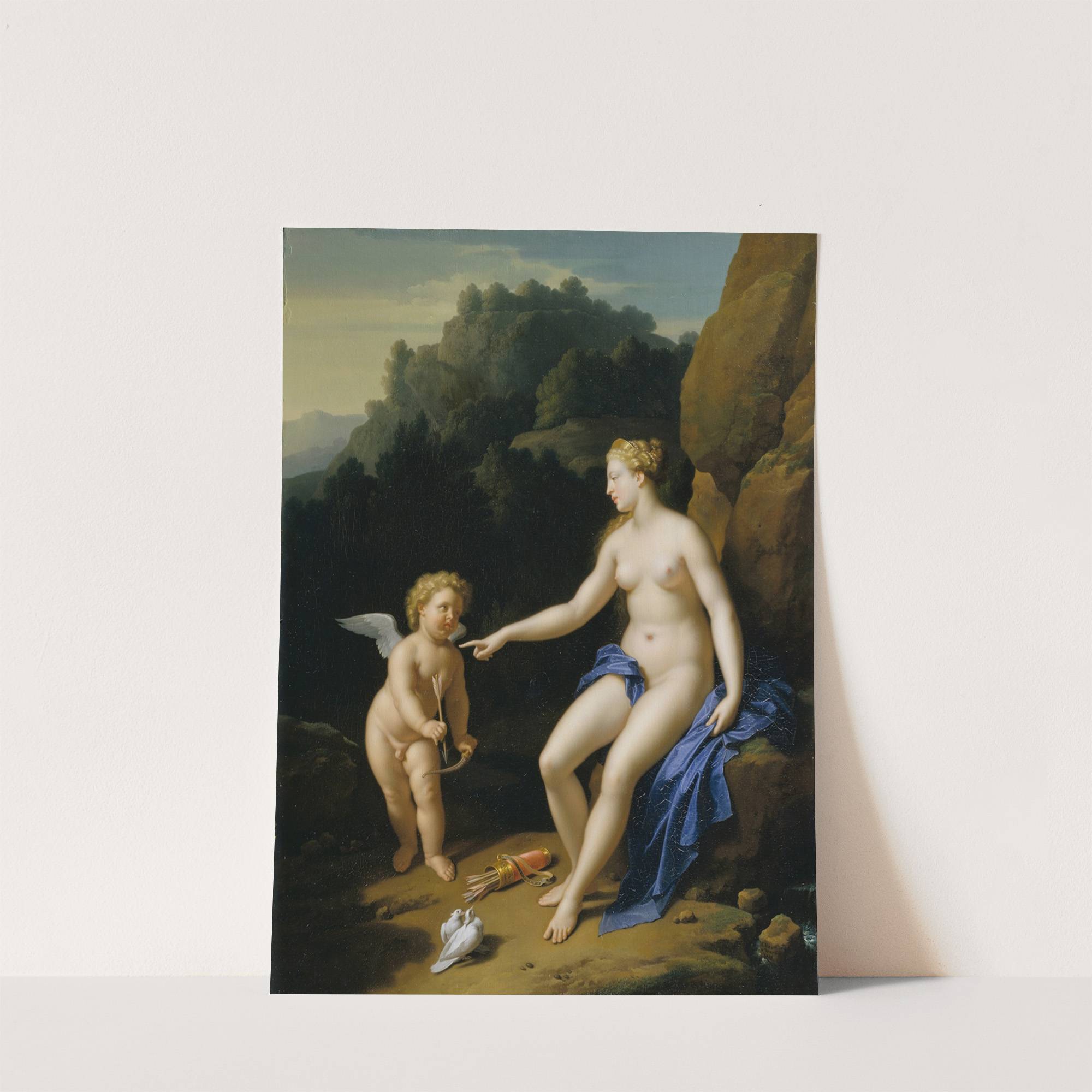 This elegant print features "Venus and Cupid" by the renowned artist Adriaen van der Werff. The artwork captures a tender moment between the goddess Venus and her cherubic son Cupid in a natural, rocky landscape. Venus, depicted with fair skin...