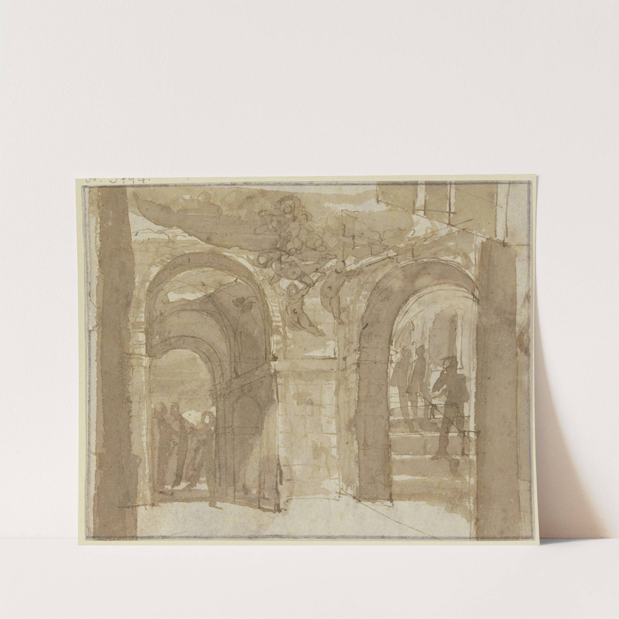 Antikes Gewölbe mit Treppe und mehreren Figuren, oben schwebt Maria mit Engeln by Bartholomeus Breenbergh - Wall Art Print