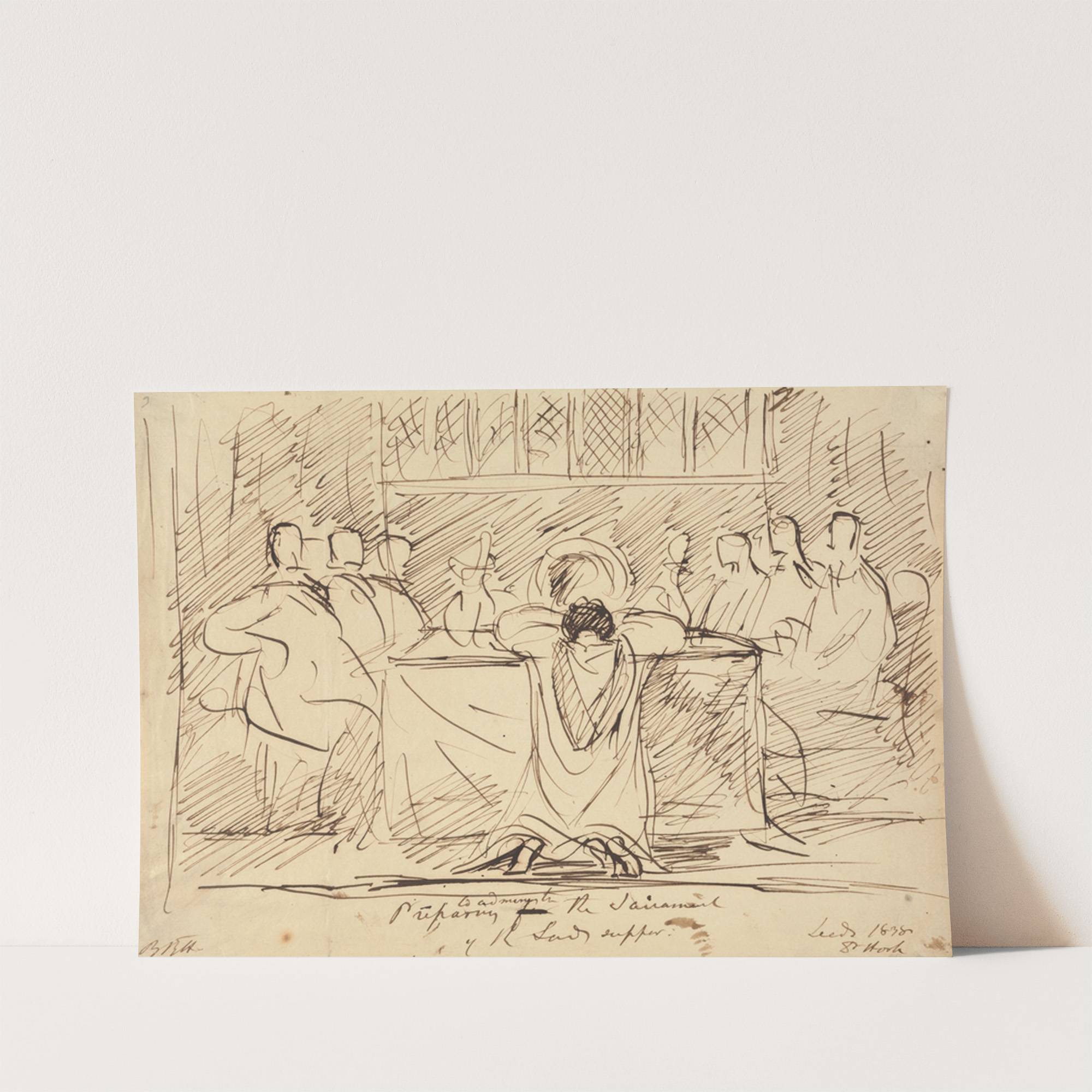 This art print features Benjamin Robert Haydon's monochromatic line drawing titled "Preparing to Administer the Sacrament" from 1838. The illustration is rendered in a fine, sketch-like style using black ink on a beige background, capturing an evocative scene with a...