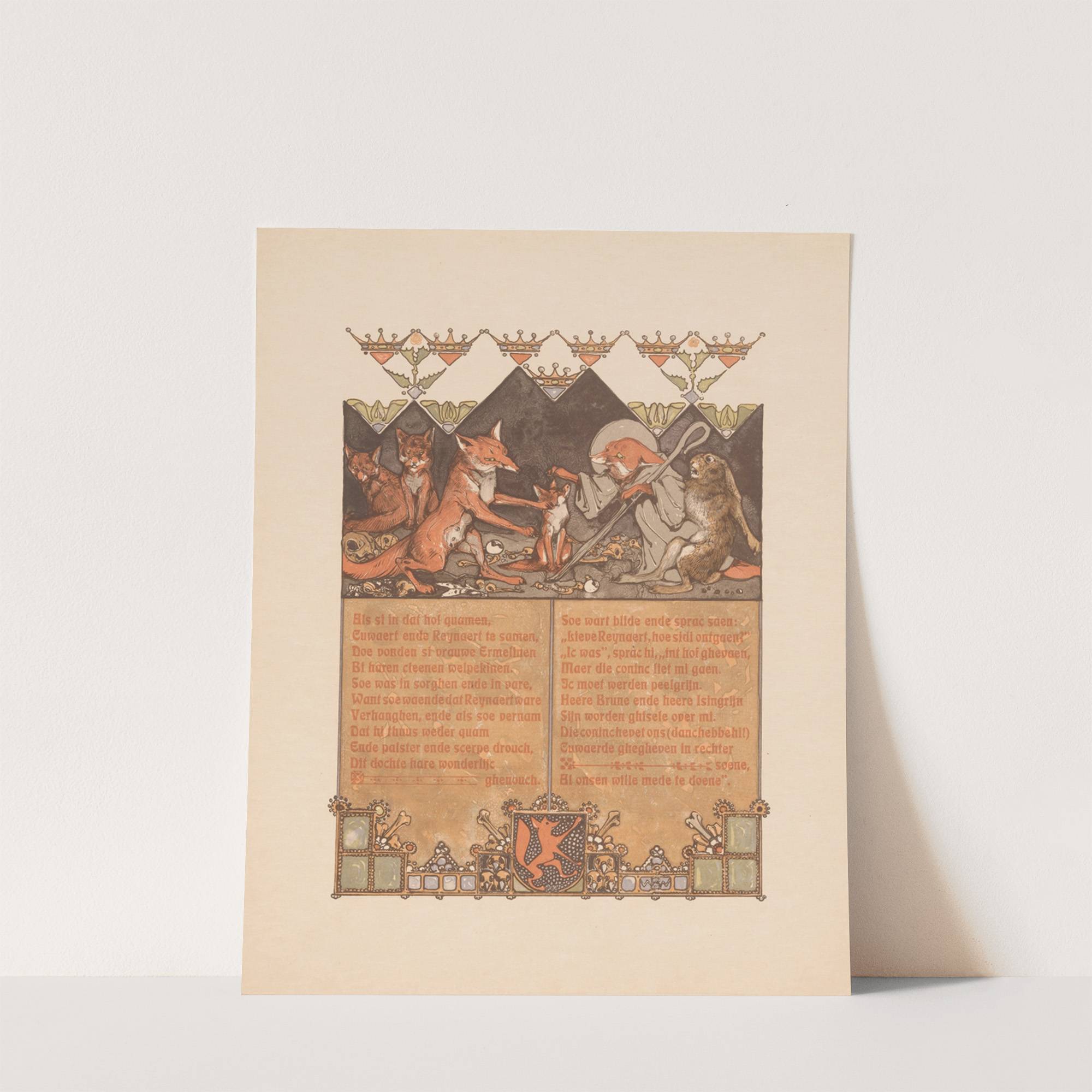 Fox in monk’s habit (Reinaert) with hare (Cuwaert) near fox (Hermeline) and cubs in fox den (1910) by Bernard Willem Wierink - Wall Art Print