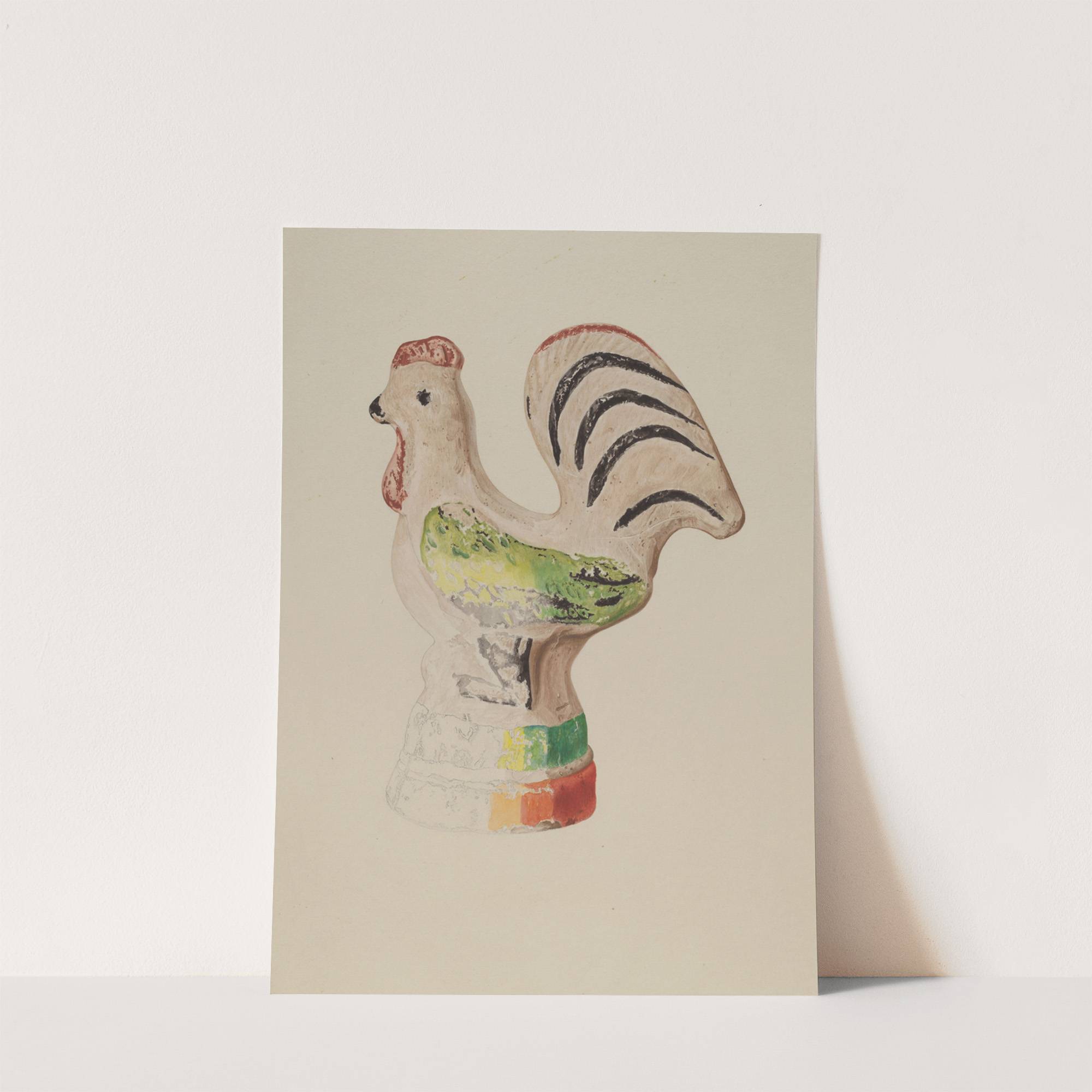 This charming piece of artwork is titled "Chalkware Rooster" by Betty Fuerst. The rooster figurine is beautifully crafted with a classic yet vibrant design. It features a white base body adorned with striking black striped patterns on its tail feathers,...
