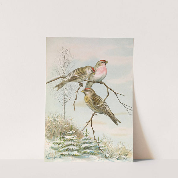 This beautiful art print features "Acanthis linaria" by Johann Friedrich Naumann, meticulously capturing the delicate beauty of three songbirds perched on a thin branch in a snowy landscape. The birds are intricately detailed with soft, pastel colors; their plumage ranges...