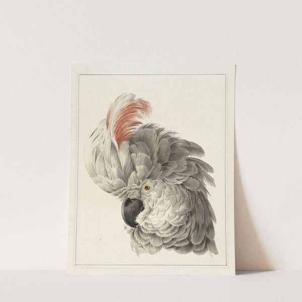 This exquisite print captures the intricate details of a cockatoo in striking monochromatic tones. The artwork, "Kop van een Kaketoe" by Aert Schouman, showcases the bird's distinctive crest, which is highlighted with delicate shades of red and orange amidst the...