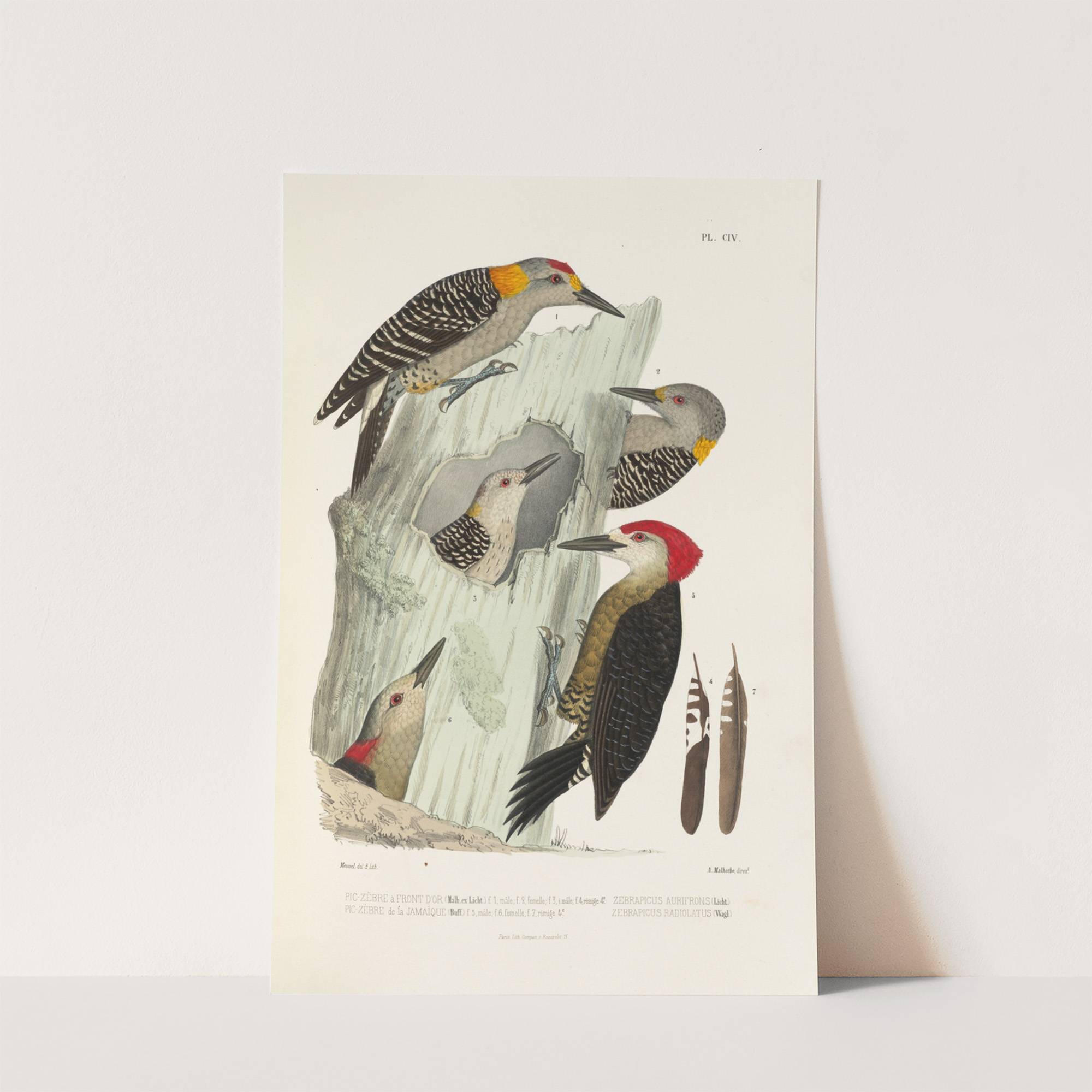 This art print features "Monographie des Picidées pl33" by Alfred Malherbe, showcasing a beautifully detailed illustration of woodpeckers. The piece is filled with vibrant colors, including red, yellow, black, and white, highlighting the distinct markings on each bird's plumage. The...
