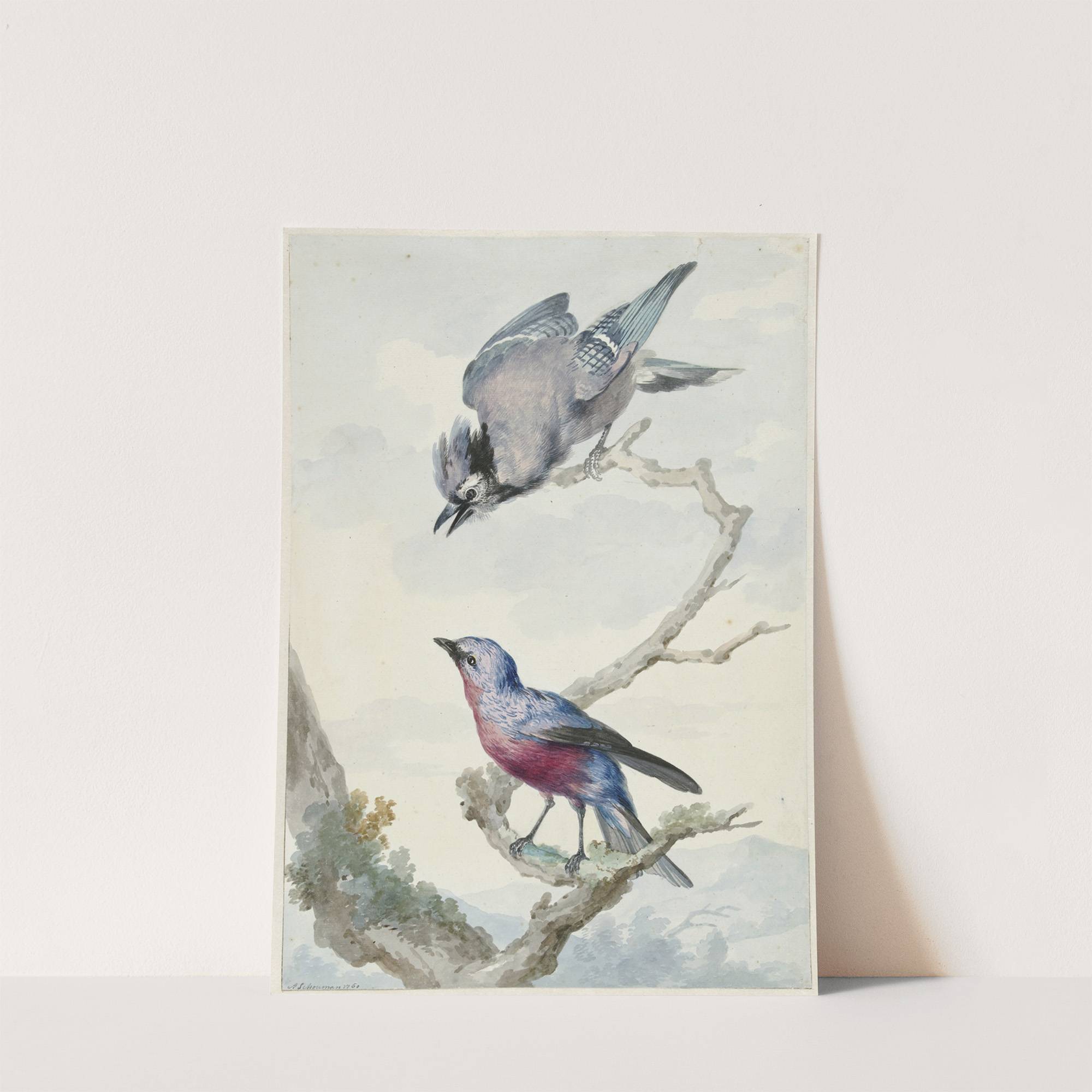 This art print features a delicate watercolor illustration of two birds perched on a branch, titled "Twee vogels; een blauwe gaai en een purperborstcotinga" by artist Aert Schouman. The upper bird is a blue magpie with a striking blue and...