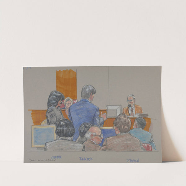 Oprah Winfrey standing as her attorney, Charles Babcock, questions plaintiff Bill O’Brien on the witness stand while the judge and others in the courtroom look on by Brigitte Woosley - Wall Art Print
