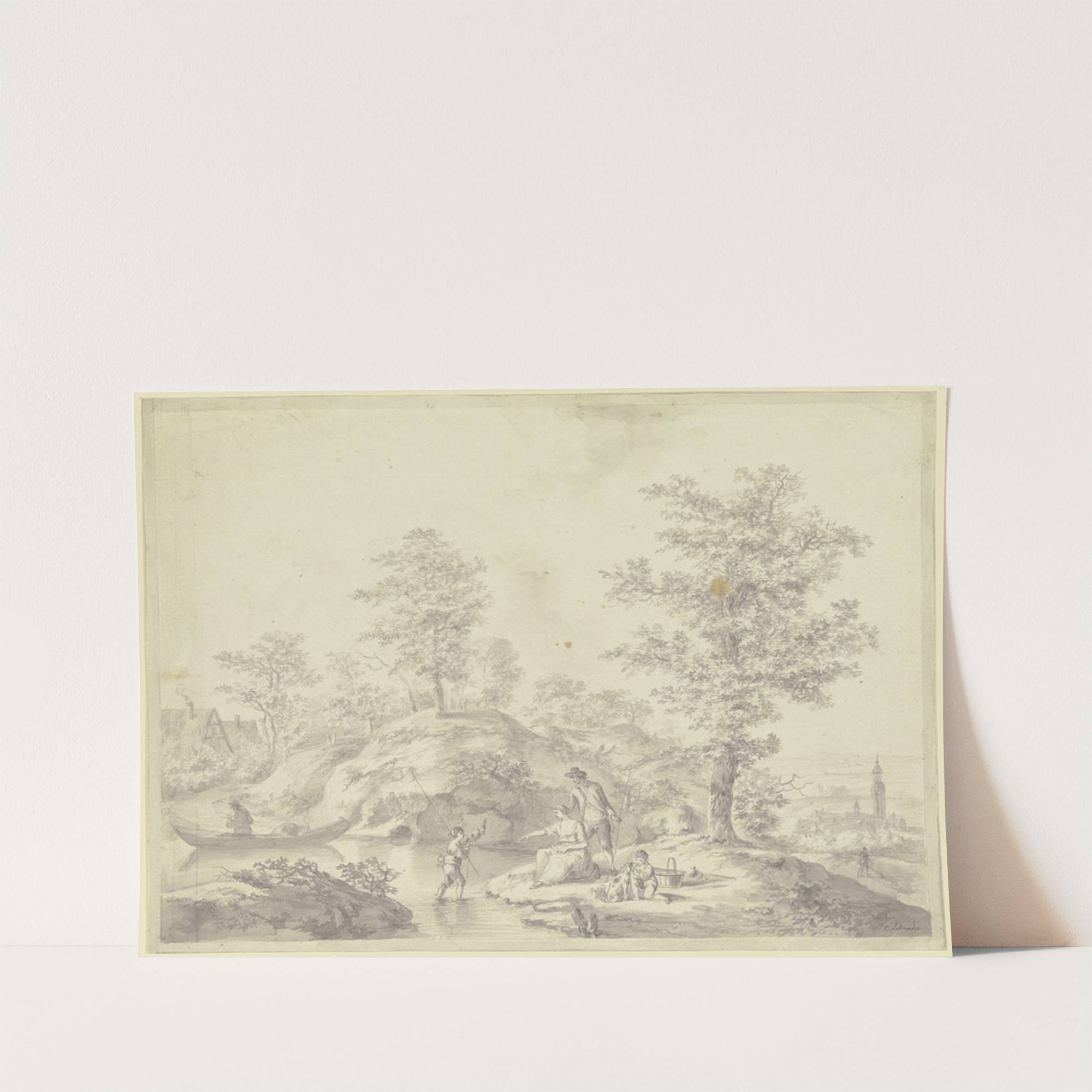 Eichbäume bei einem Dorf, im Vordergrund eine Familie beim Fischen by Caspar Schneider - Wall Art Print