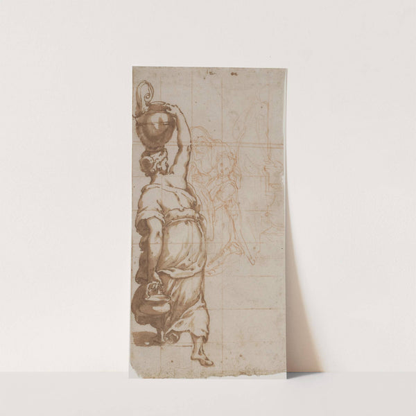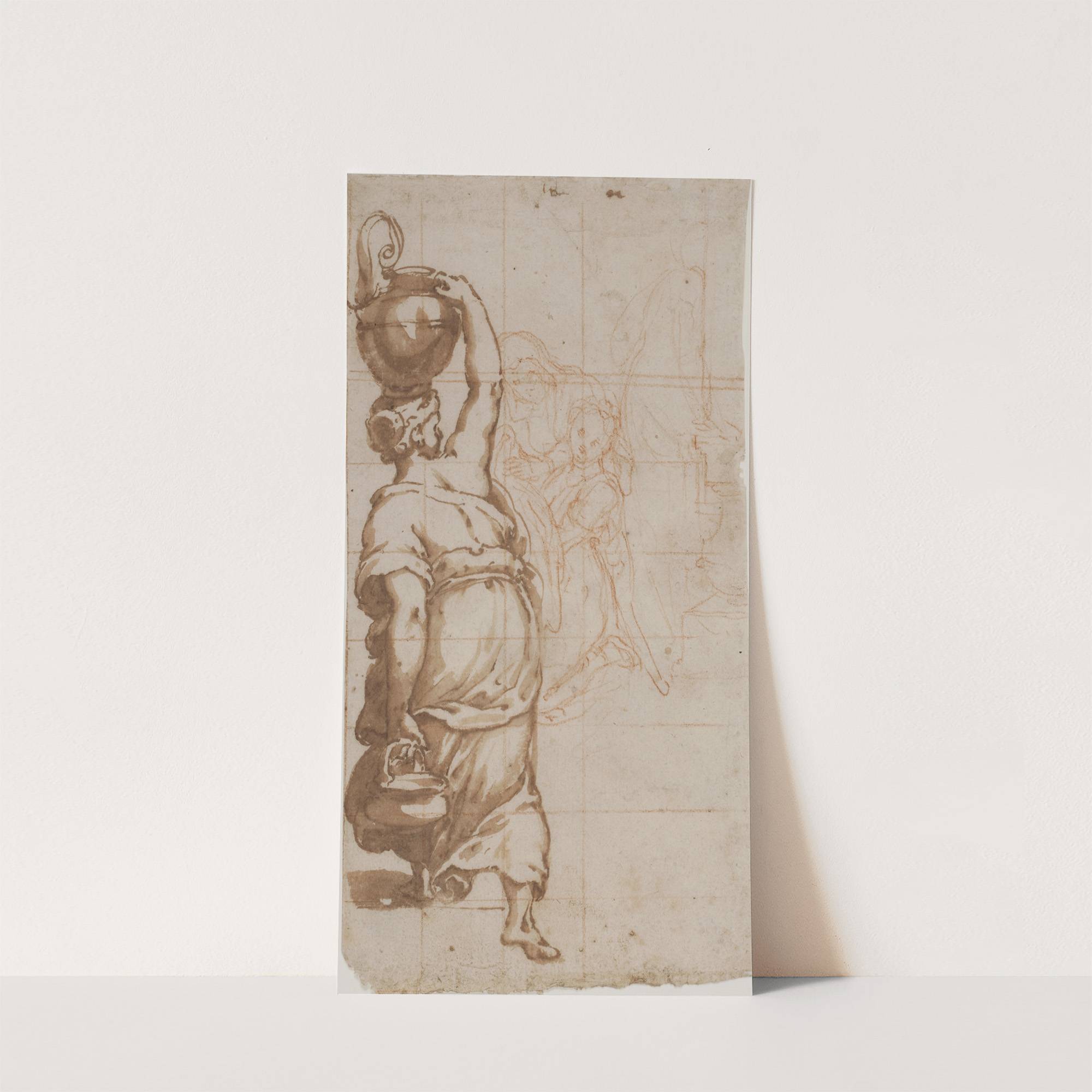 Kvinde med krukke på hovedet set bagfra, to kvinder med et klæde i baggrunden by Cesare Nebbia - Wall Art Print