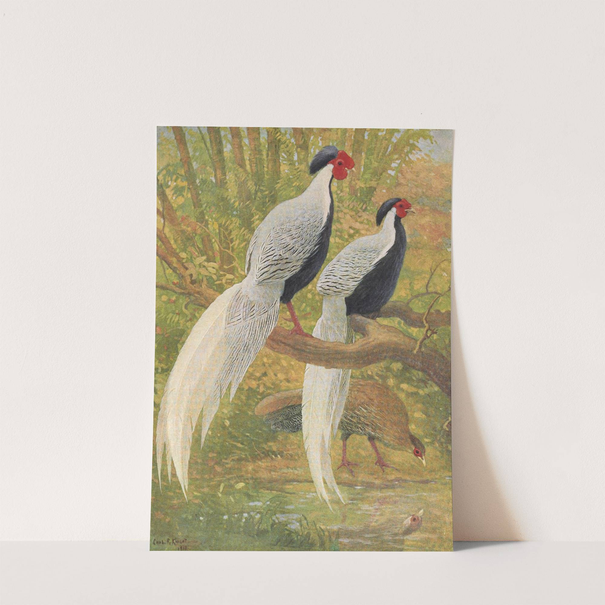 This exquisite art print titled "Chinese Silver Pheasant" by Charles Robert Knight is a captivating depiction of two pheasants perched on a branch in a serene forest setting. The composition showcases the pheasants in stunning detail, with their vibrant plumage...