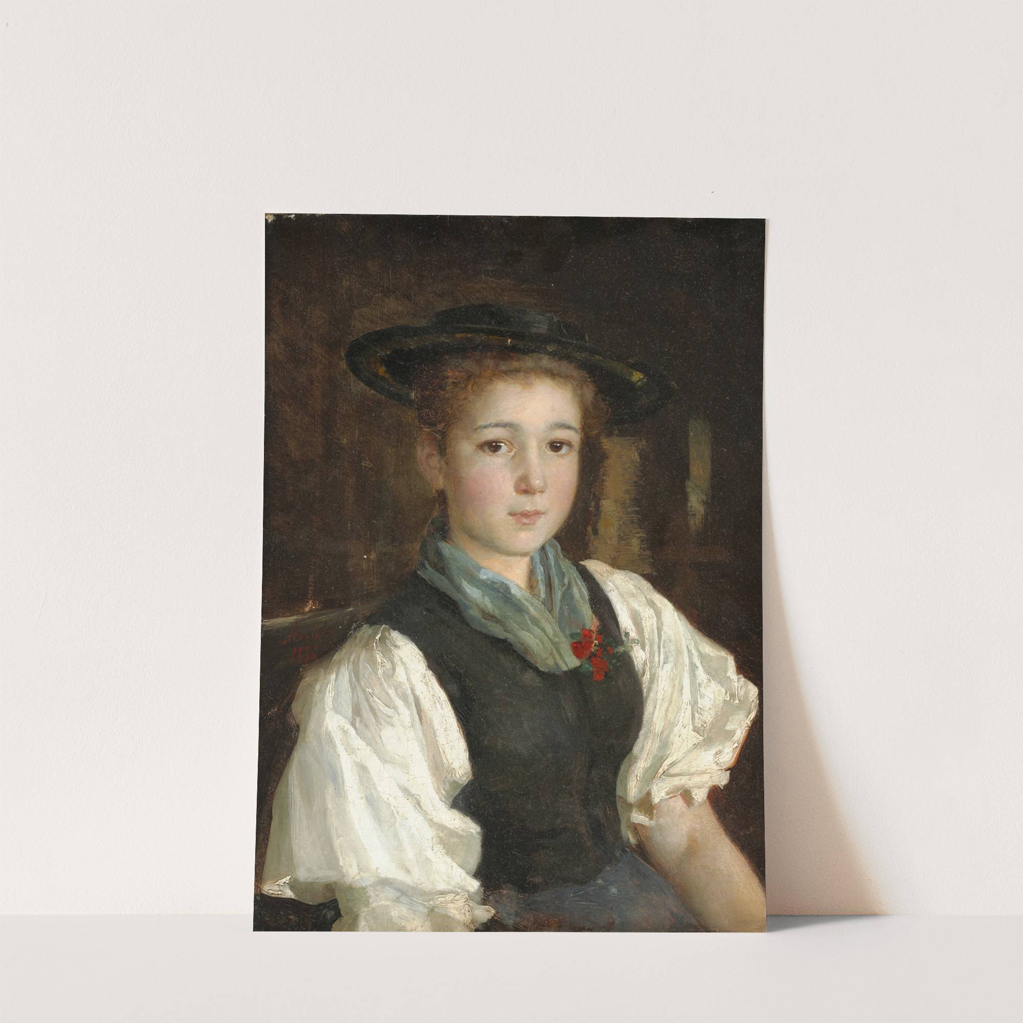 This beautiful oil painting depicts "Bauernm?dchen" (Farm Girl), created by the renowned artist Albert Anker. The portrait features a young woman with fair skin, light brown hair partially visible under her black bereShe wears a traditional outfit consisting of a...