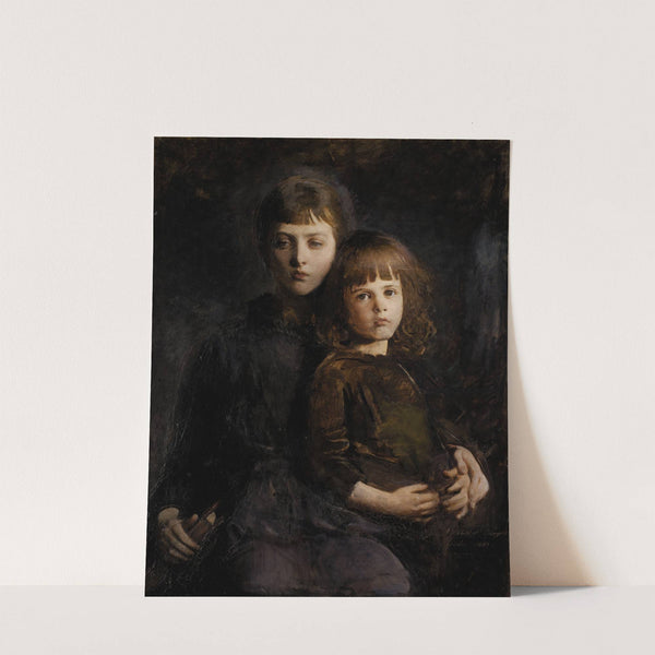 This evocative portrait features two young children positioned against a dark, almost black background. The artist, Abbott Handerson Thayer, employs a rich, muted color palette that emphasizes the emotional depth of the scene. In the foreground stands a girl with...