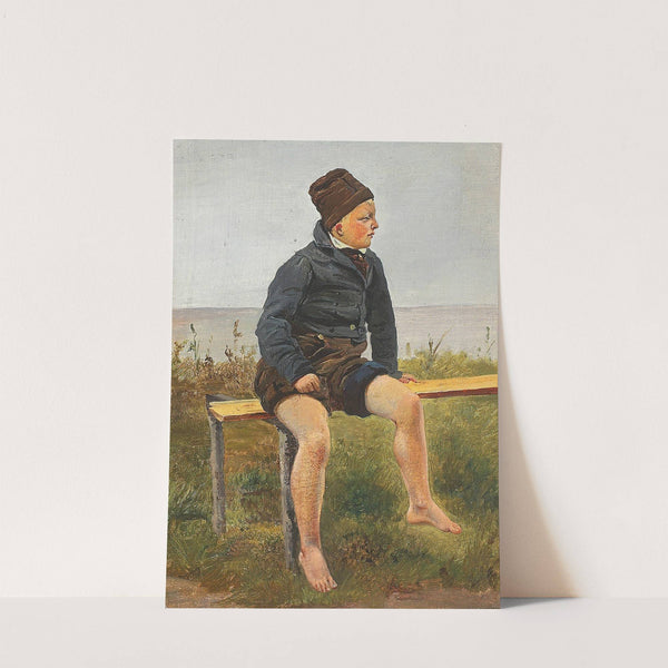 This beautifully rendered print depicts "En fiskerdreng" (The Young Fisherman) by the artist Anders Christian Lunde. The painting captures a young boy sitting on a wooden bench in an outdoor, grassy setting. The boy is dressed warmly in a dark...