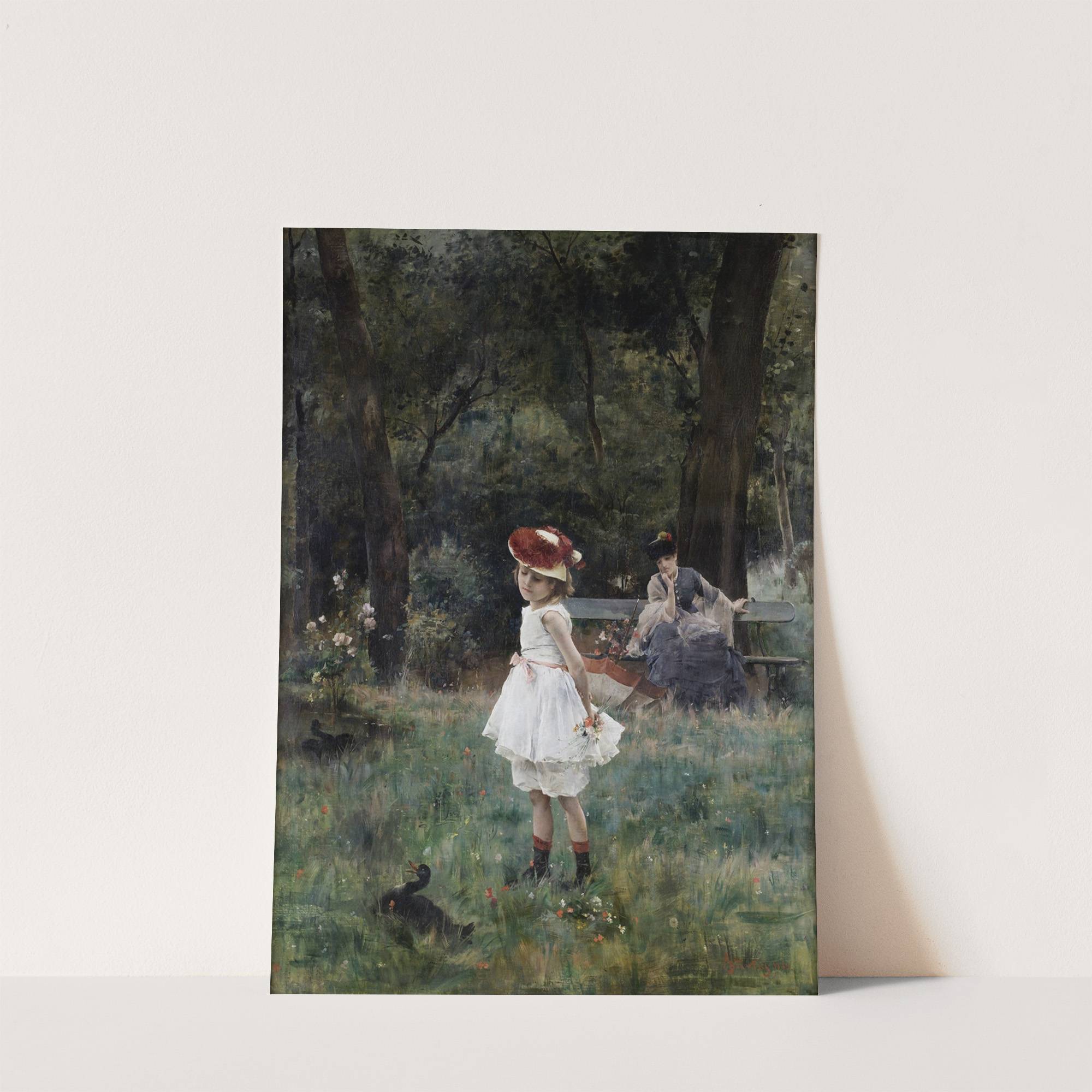 This enchanting art print features "La Fillette Aux Canards" by Alfred Stevens, showcasing a beautifully painted scene of a young girl in a lush forest setting. The central figure is a delicate girl with fair skin, dressed in a white,...