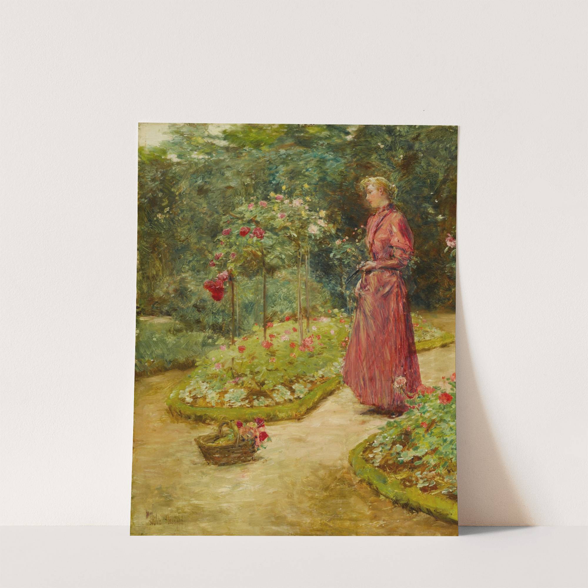 Woman Cutting Roses in a Garden by Childe Hassam - Wall Art Print