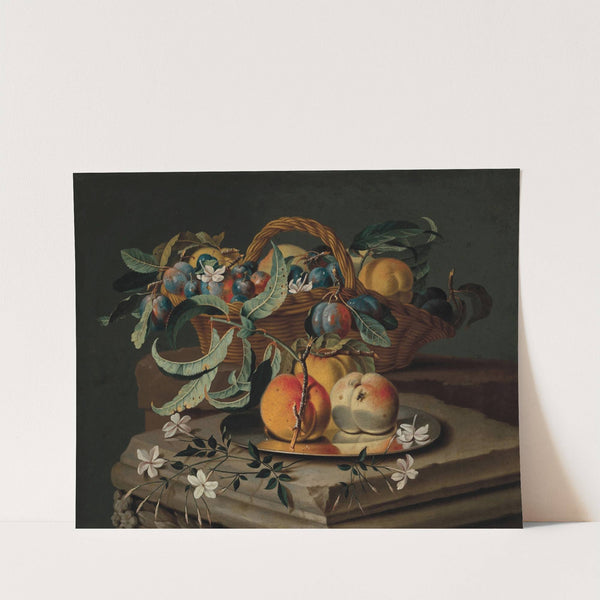 Peaches and plums in a basket and on a pewter plate, with flowers on a stone plinth by Christian Berentz - Wall Art Print