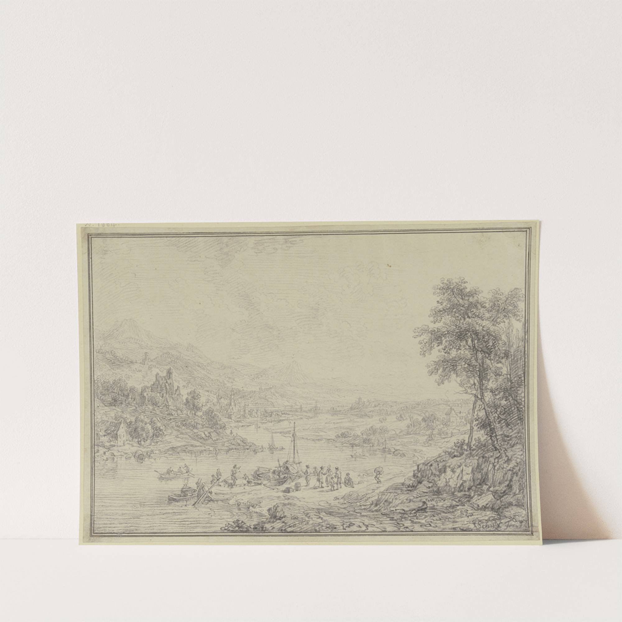 Flussgegend mit einem Städtchen im Tal, Burgen und Schlössern auf den Bergen, vorne am Ufer Schiffe und figürliche Staffage by Christian Georg Schütz the elder - Wall Art Print