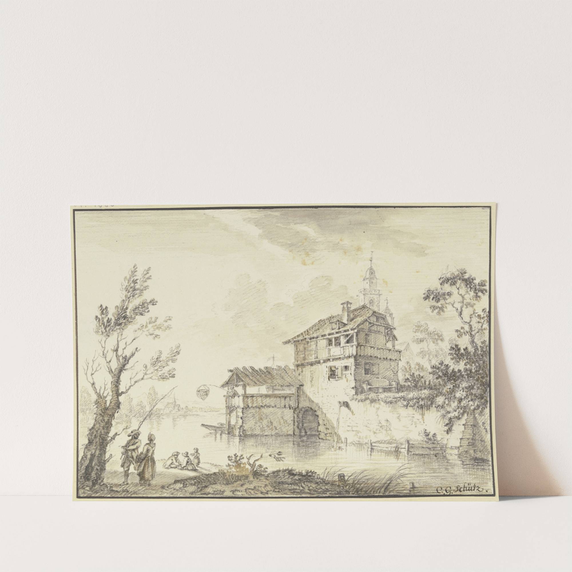 Häuser an einem Wasser, von einem Vorbau aus fischt ein Mann mit einem Netz, links an einem Baum ein Angler mit seiner Frau by Christian Georg Schütz the elder - Wall Art Print