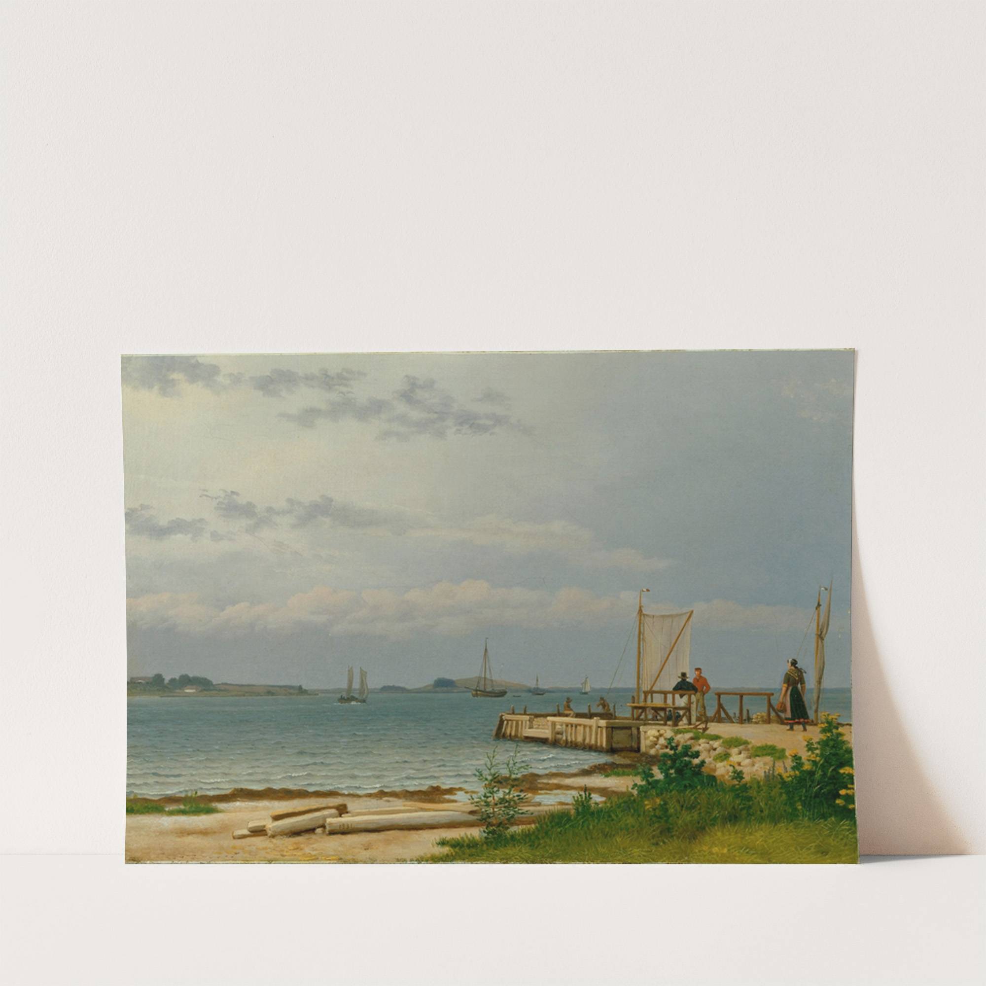 This tranquil landscape print features a serene coastal scene captured with delicate realism by the artist Christoffer Wilhelm Eckersberg. The view is directed towards the distant shoreline from a wooden pier that extends into a calm, blue sea. In the...