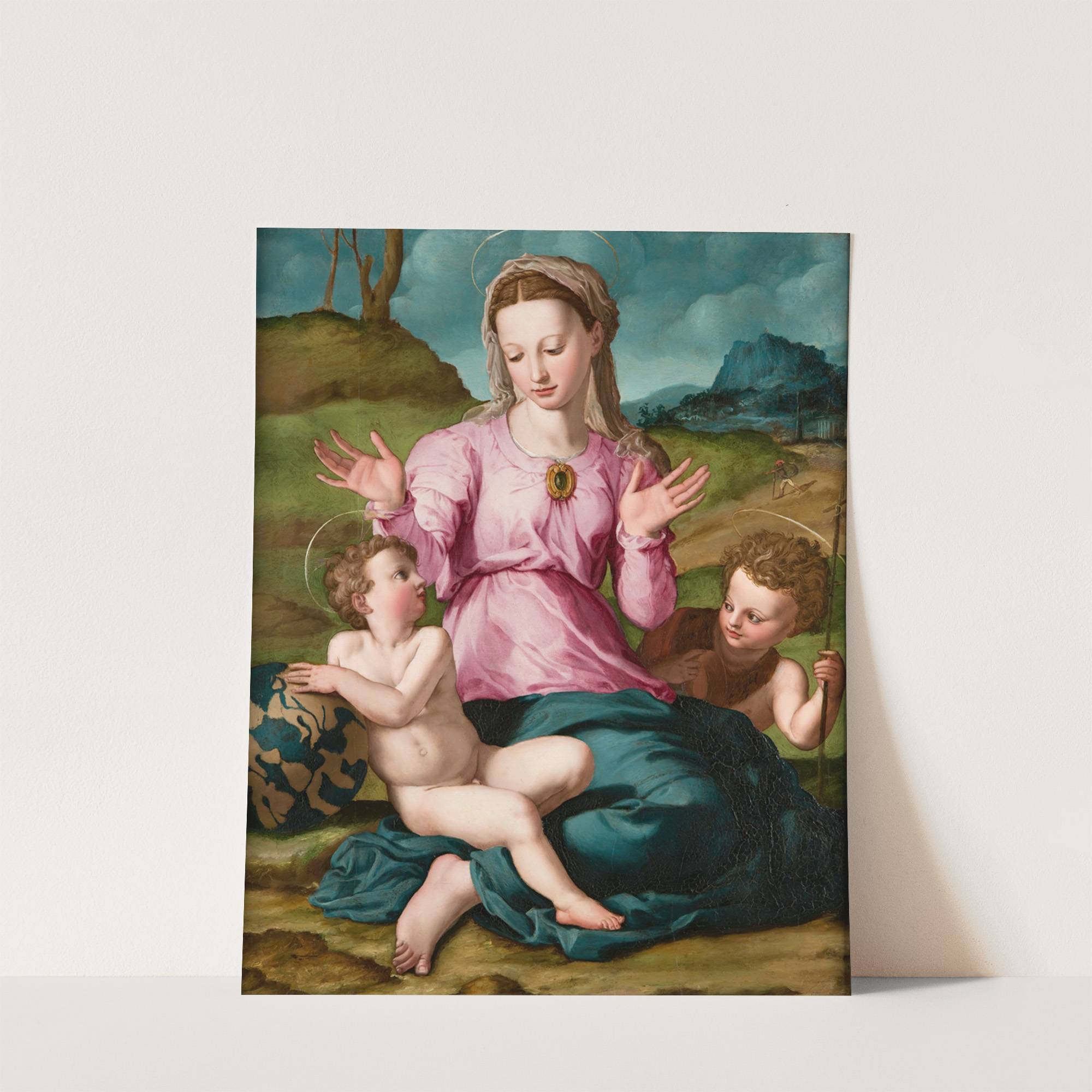 This exquisite art print features "Madonna and Child with Saint John the Baptist" by Agnolo Bronzino. The piece beautifully captures the serene maternal presence of Mary, depicted in a soft pink gown with delicate long sleeves and a modest neckline,...
