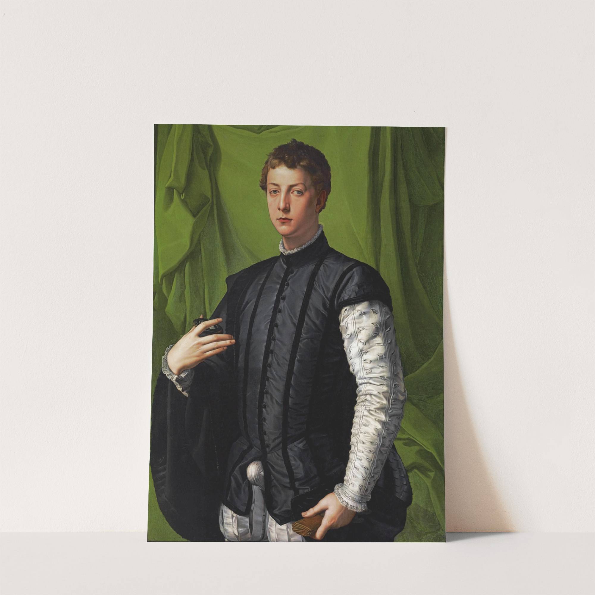 This art print features "Portrait of Lodovico Capponi" by the renowned artist Agnolo Bronzino. The portrait showcases a young man standing against a rich, green velvet backdrop that adds depth and contrast to his attire. He wears a sleek black...