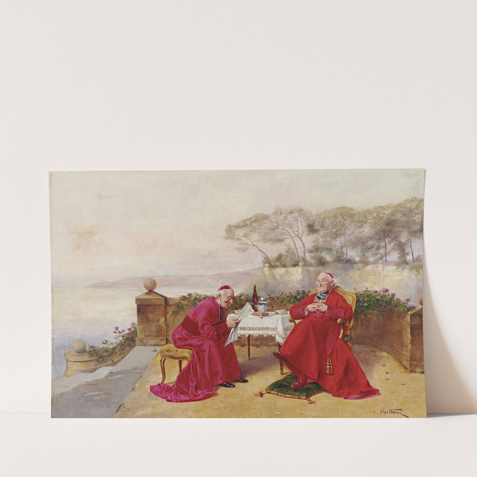 This vibrant art print titled "Teatime On The Balcony" by Alfred Charles Weber beautifully captures an intimate scene featuring two ecclesiastical figures enjoying a serene moment together on a balcony overlooking a tranquil seaside landscape. The figures, dressed in rich...