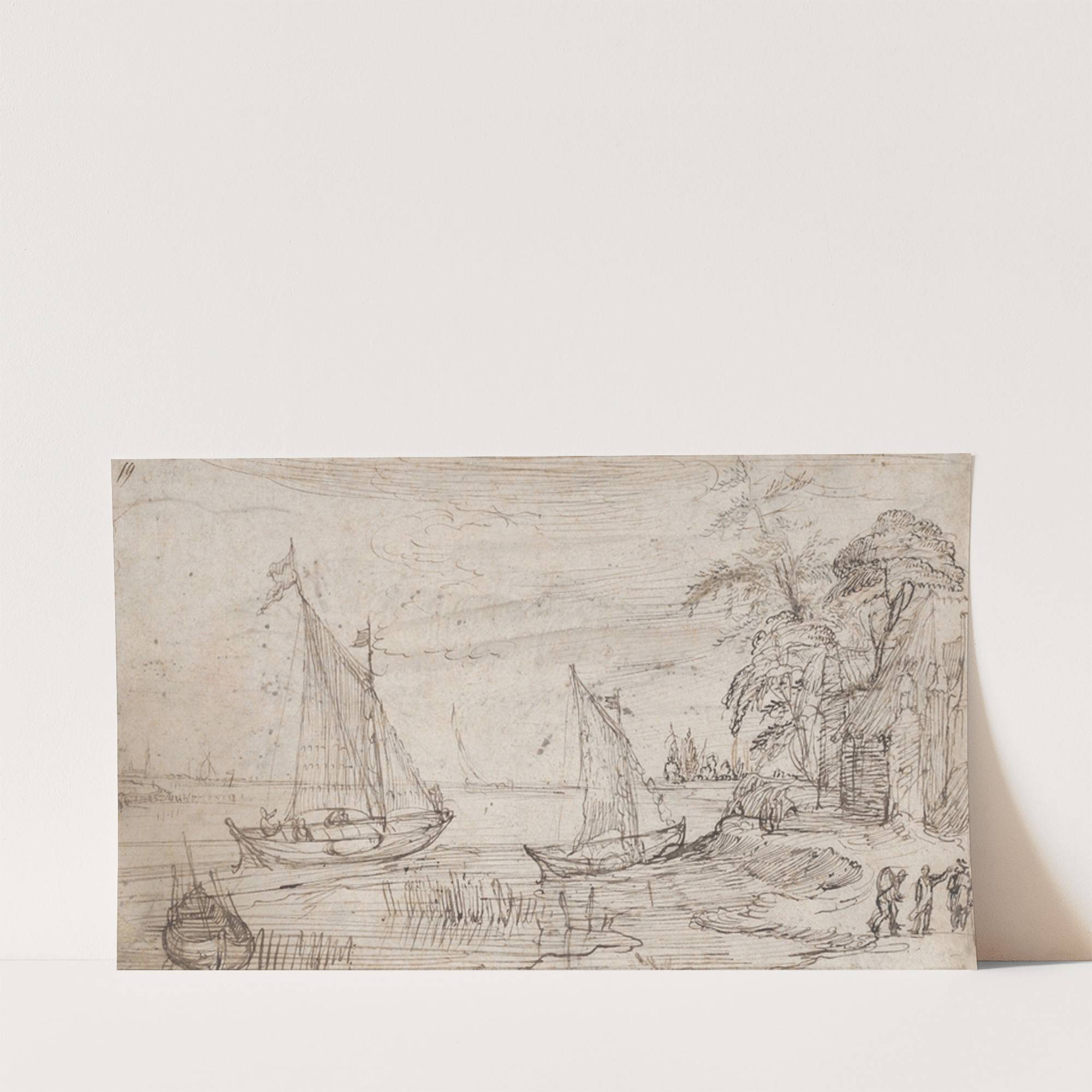 Riverscape with Two Sailboats and Several Figures (early 17th century) by Cornelis Claesz. van Wieringen - Wall Art Print