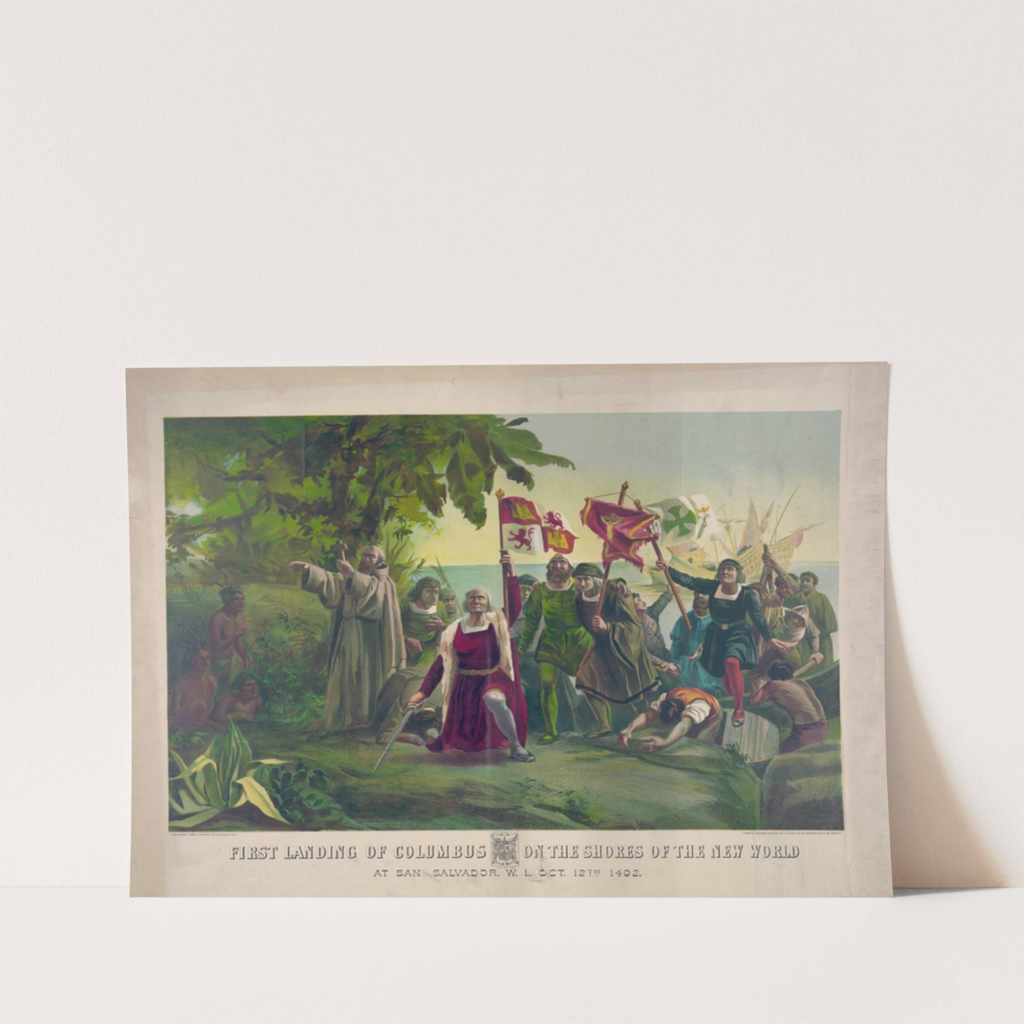 This artwork depicts "First Landing of Columbus on the Shores of the New World; At San Salvador, W.I., Oct. 12th 1492" by Currier & Ives. The illustration features a vibrant and detailed scene of Christopher Columbus's arrival in the New...