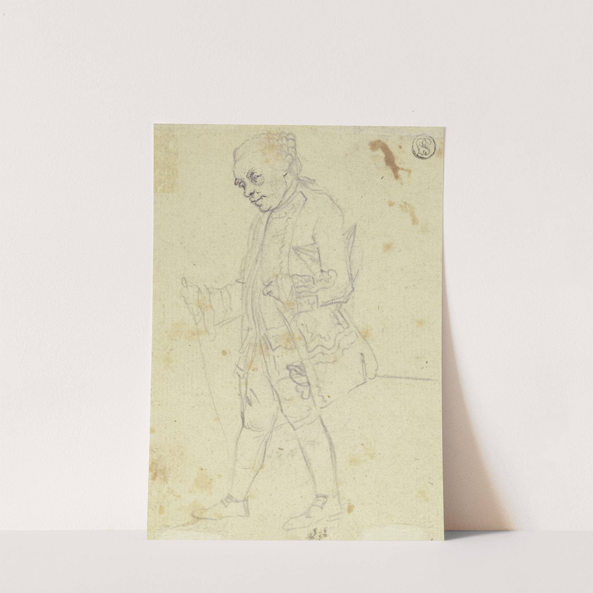 Nach links schreitender Mann im Dreiviertelprofil, in der Rechten einen Stock haltend, den Hut unter den linken Arm geklemmt by Daniel Nikolaus Chodowiecki  - Wall Art Print