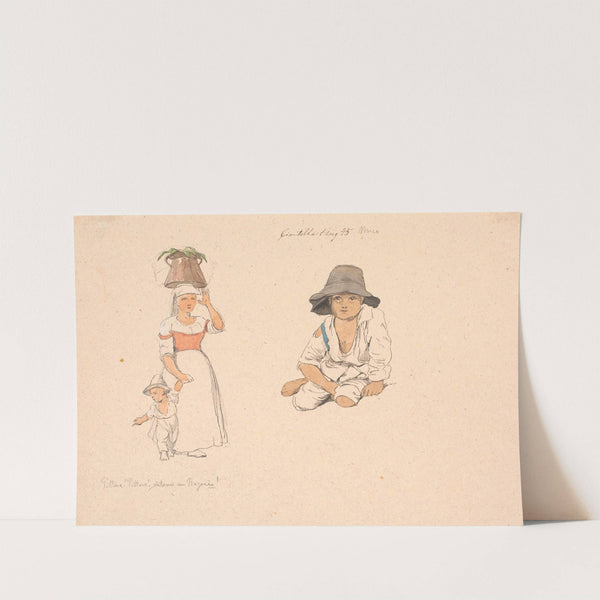 Italienderinde med en spand på hovedet og en tiggende dreng ved hånden Til højre studie af en siddende italienerdreng by Johan Thomas Lundbye - Wall Art Print