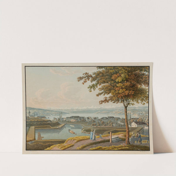 This vibrant art print titled "Vue du lac et des environs de Zurich depuis le Rempart du Chat" by David Alois Schmid captures a picturesque lakeside scene in the style of traditional Swiss landscape painting. The compIn the foreground, a...