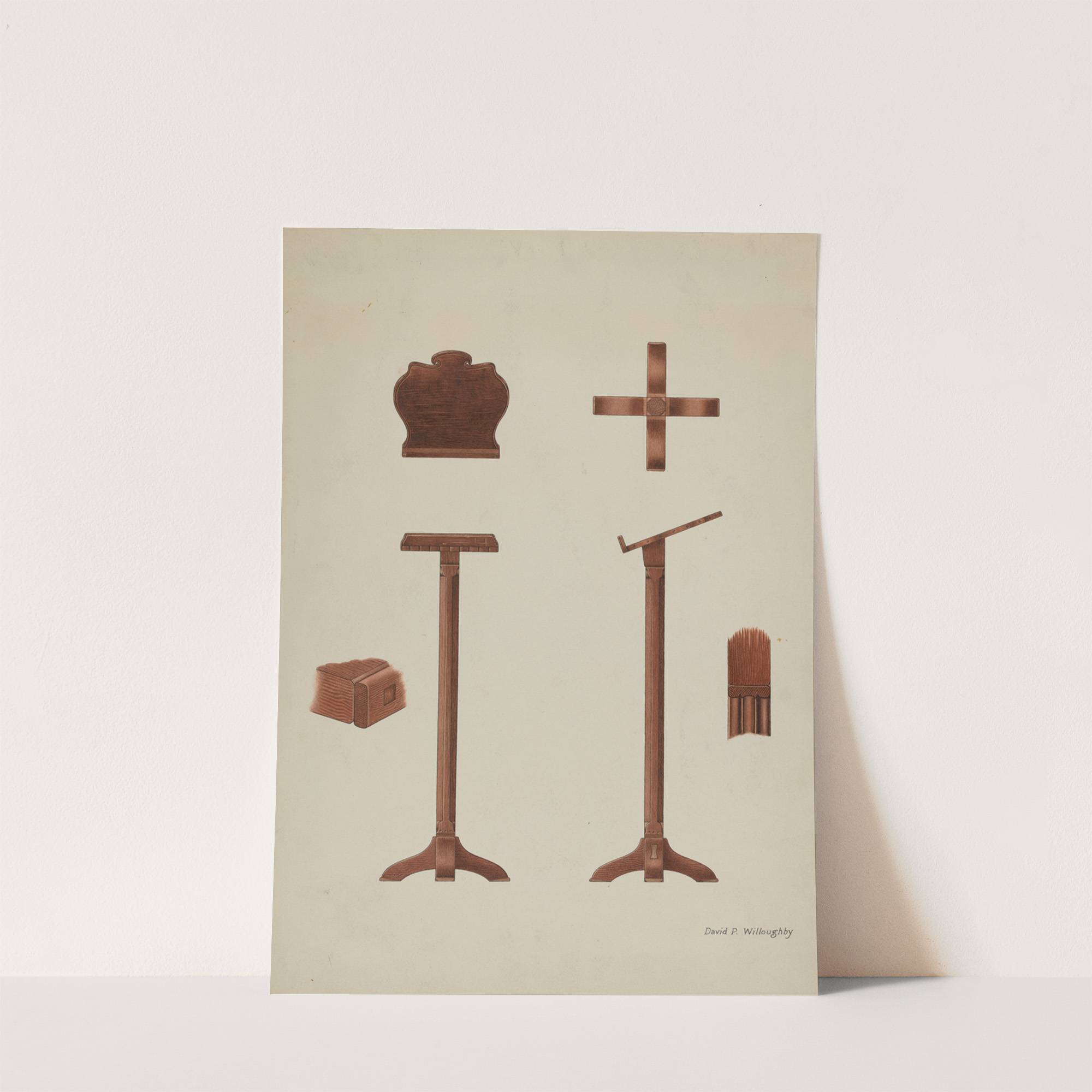 This art print features "Lectern (Reading Stand)" by David P. Willoughby, showcasing a detailed illustration of various wooden lectern components. The image is rendered in a traditional, illustrative style with rich, deep brown hues that highlight the craftsmanship of each...