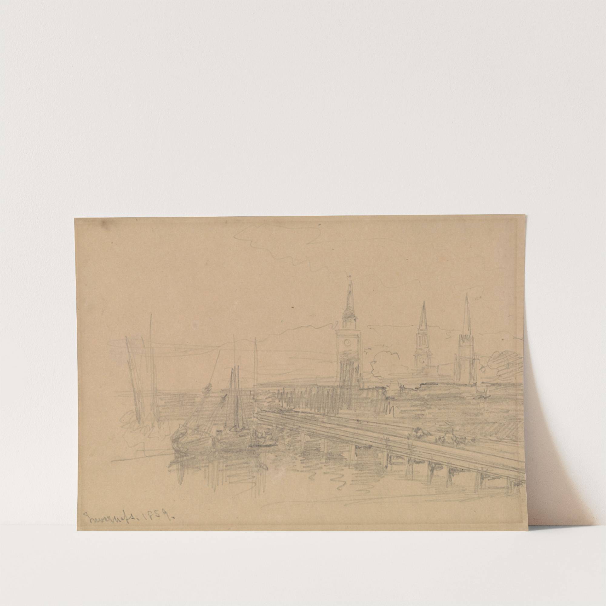 This monochromatic sketch captures the serene beauty of Inverness, showcasing its iconic architectural elements with delicate pencil lines. The image portrays several prominent spires of church towers rising above a tranquil waterfront. Sailboats with tall masts are gently docked along...
