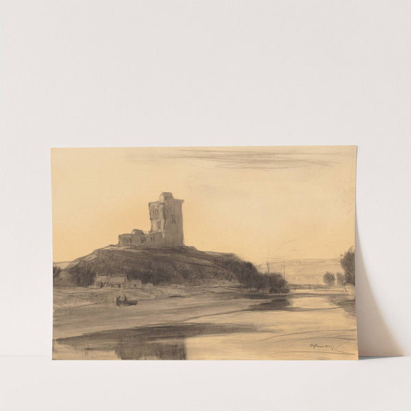 This captivating art print features "The Red Castle" by David Young Cameron, rendered in a sepia-toned monochromatic palette that exudes timeless elegance. The scene depicts an ancient stone castle perched atop a gently sloping hill, surrounded by sparse trees and...