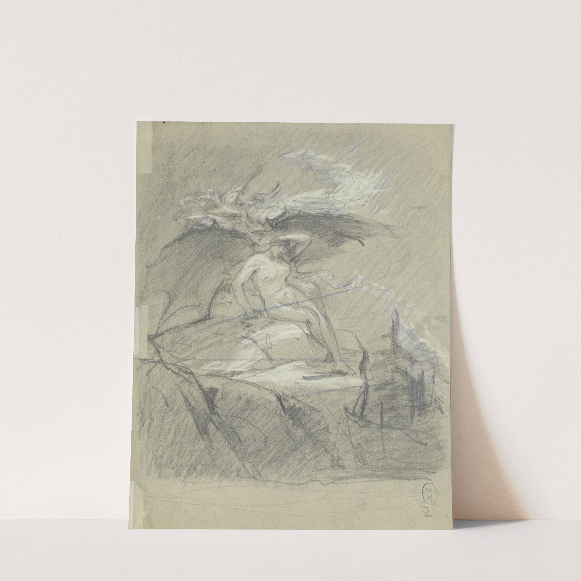 Geflügelter weiblicher Akt auf einem Felsen by Dora Hitz - Wall Art Print